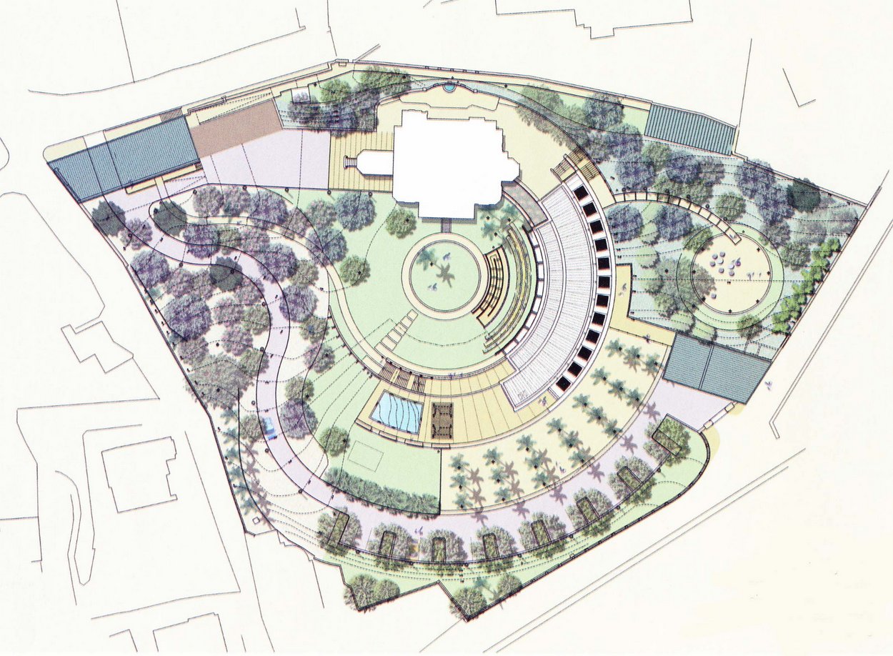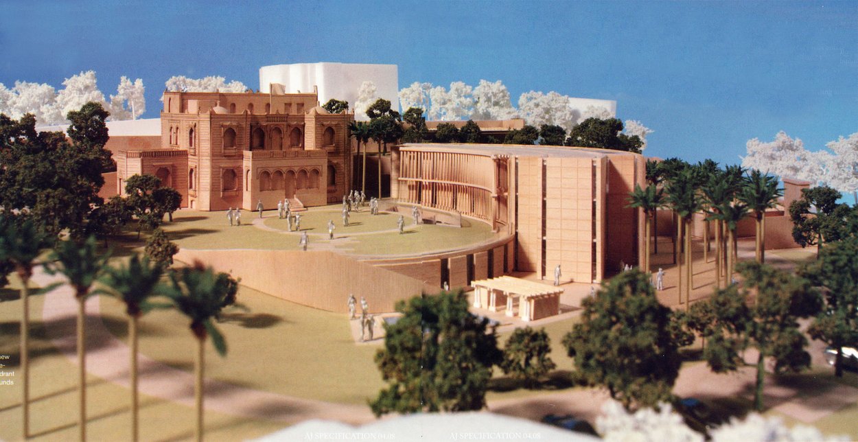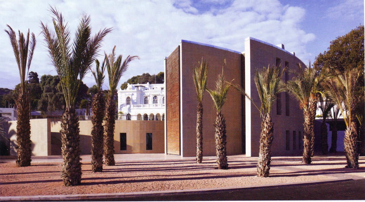 In 2004, spurred by physical security concerns, a new project was launched for offices in the Villa Emerald Park grounds. John McAslan and Partners won the commission for the design with a layout plan that skilfully exploited the sloping garden site and respected the residence building. The offices are a three storey hollow quadrant centred on a circular lawn in front of the residence, and clad in a fine buff sandstone (sourced from China) with elegant twisted vertical timber sunscreening of weathered guariuba. Mace International was the project manager and main contractor, with Byalge the main subcontractor. The building was completed in 2009.