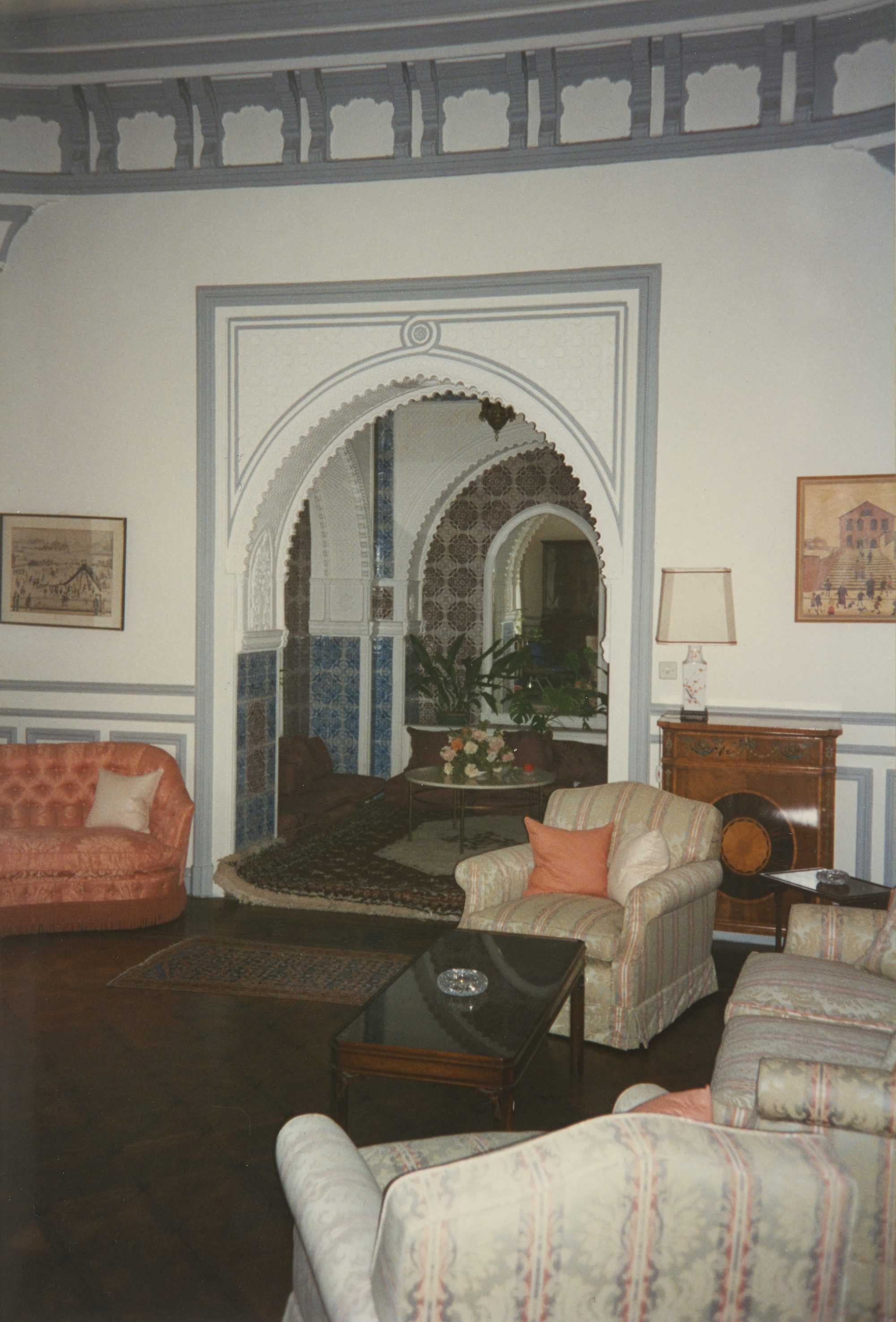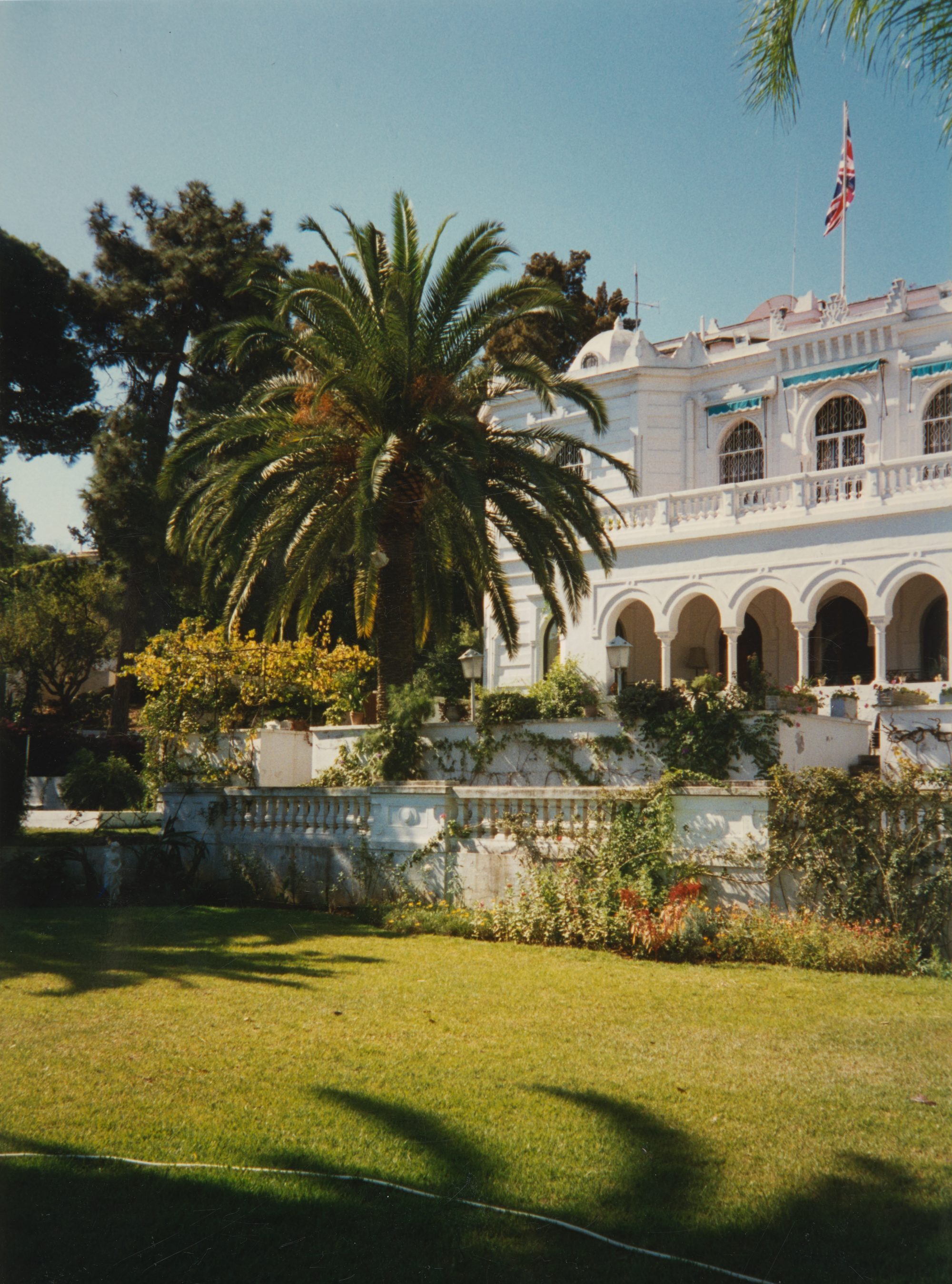 The villa was an elegant mid-nineteenth century building at the junction of Chemin des Glycines with Rue Dr Raynaud on the Mustapha Hill, with fine views east over the port and harbour. It was built by baron de Royer, and was bought in the 1880s by a syndicate of British residents who turned it into the English Club, open from November to May each year. General de Gaulle had his office in the house during the Second World War and, in the years prior to its purchase, it was being used as the Germain Estate Office. It was in poor condition and ingoing works costing about £35,000 were completed in December 1965. Diplomatic relations had by then been broken and so the house was not occupied by a British ambassador until their resumption in June 1968.