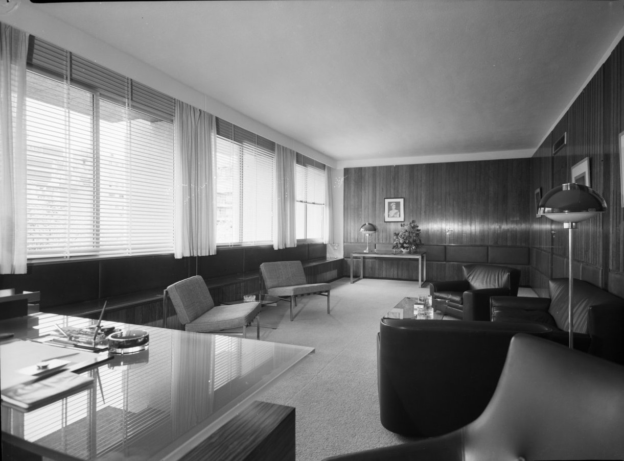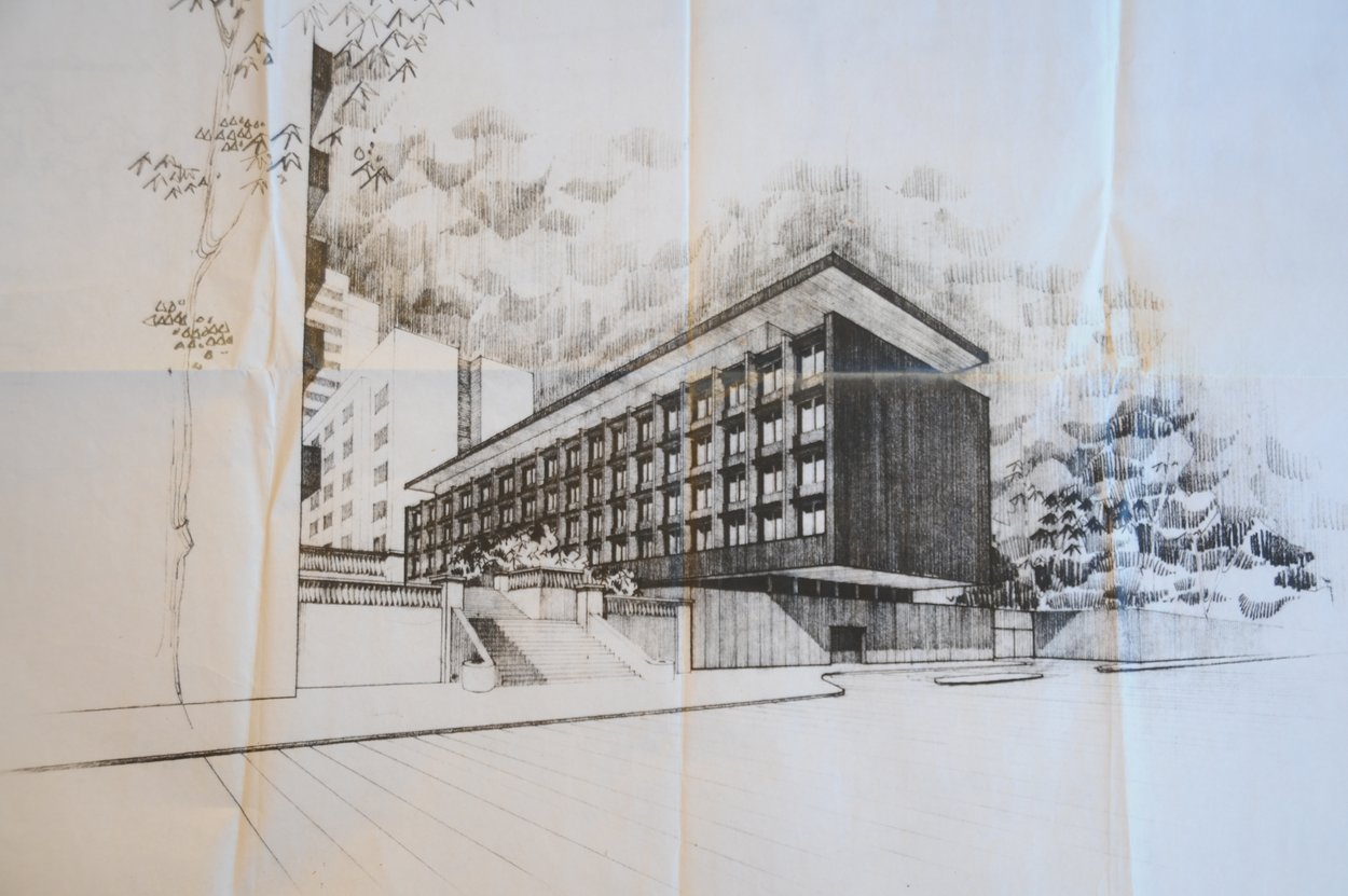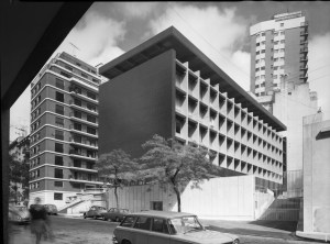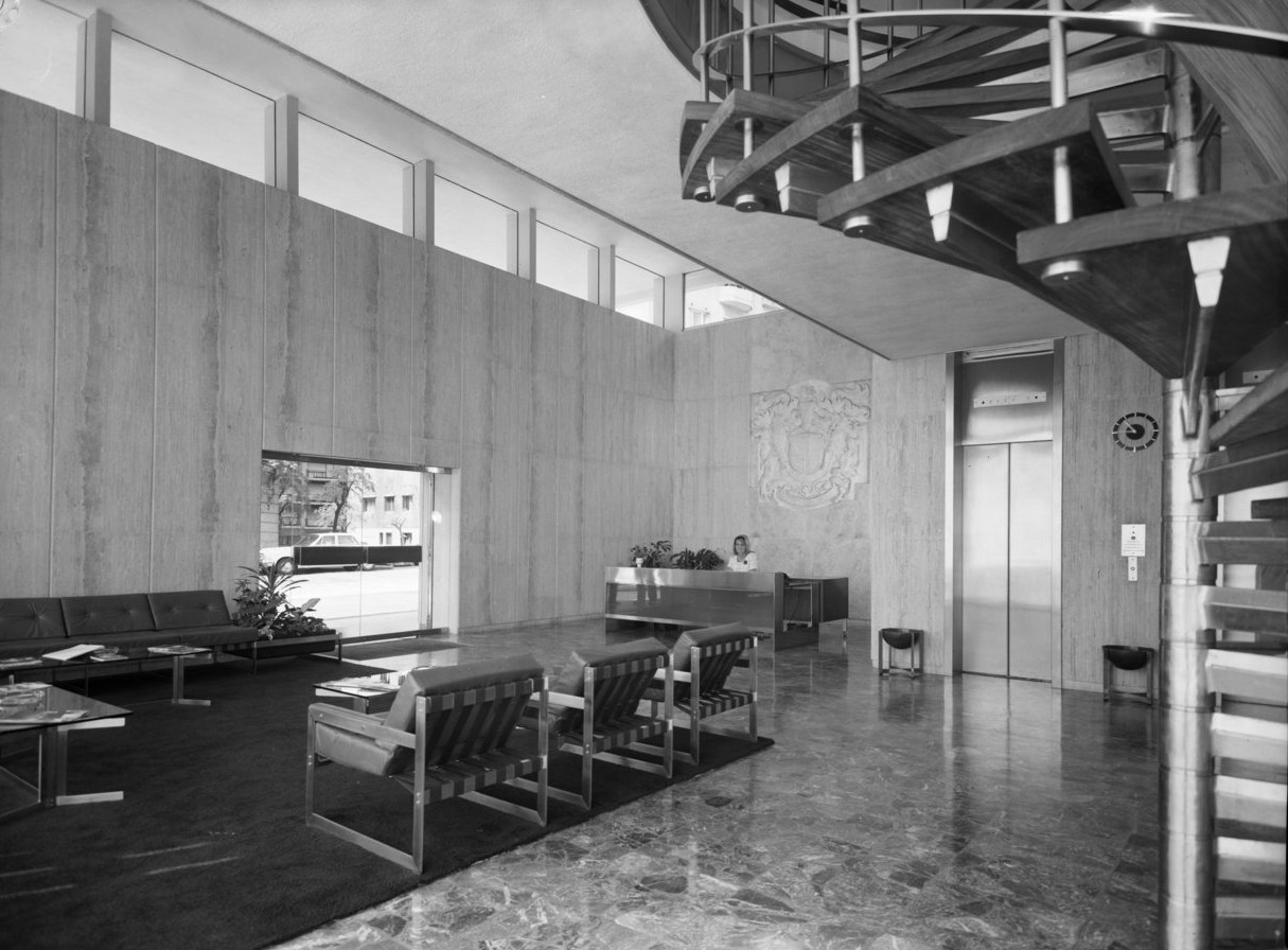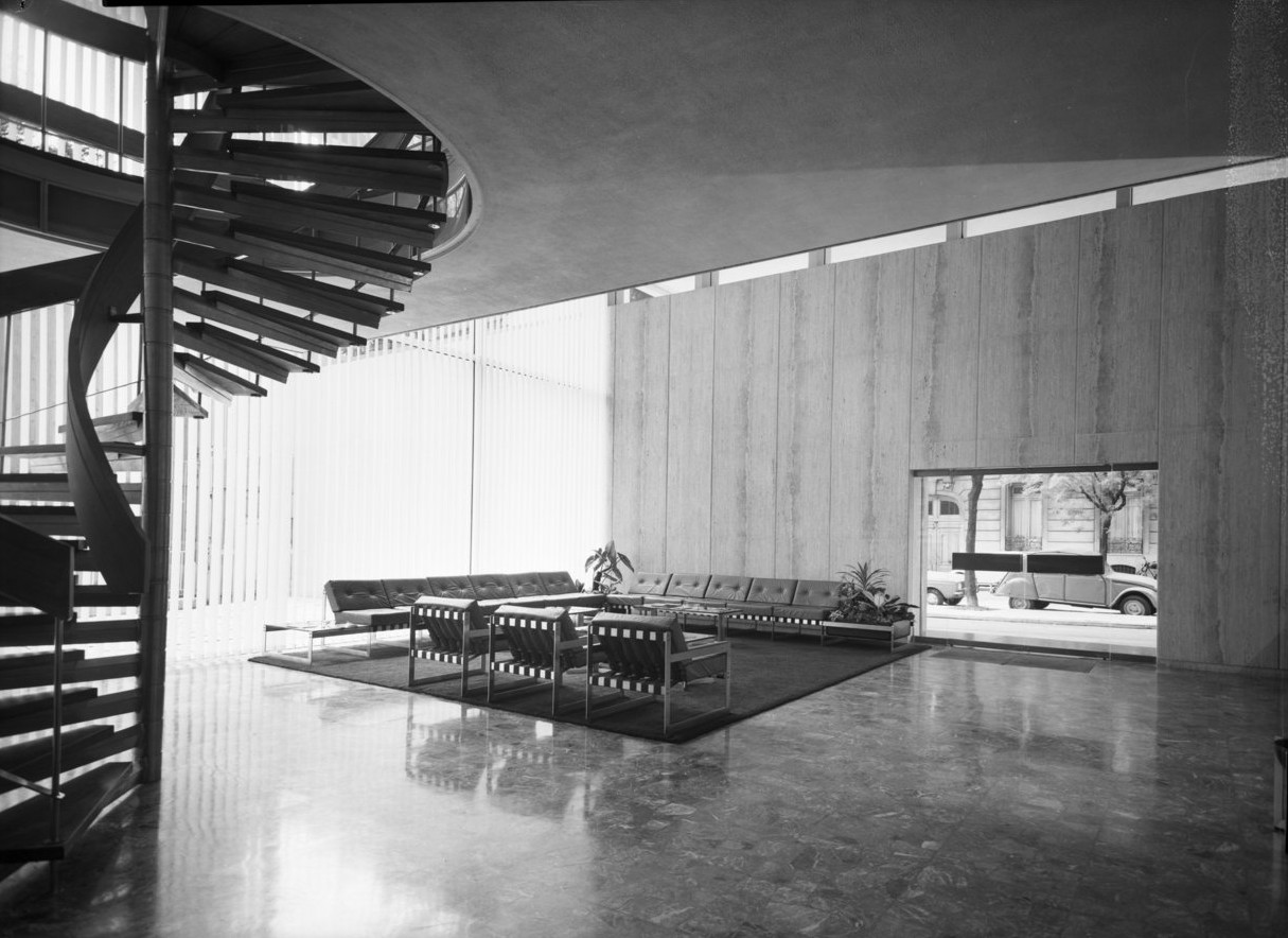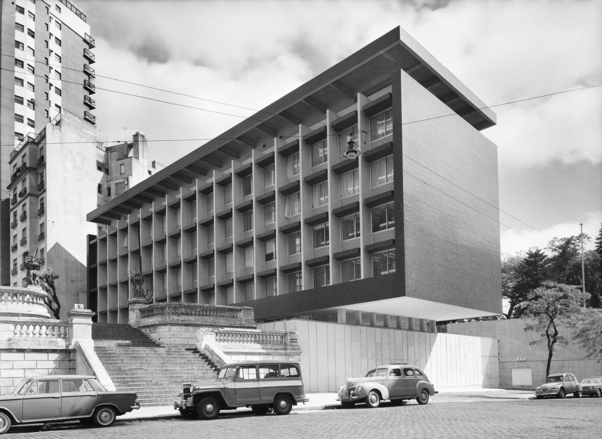From at least 1920, the legation offices (Buenos Aires became an embassy in 1927) and the consulate-general were both leased on the upper floors of the Edificio Britanico, the Royal Mail Steam Packet Company’s Edwardian office block on the corner of Calles Reconquisita and Sarmiento. Design work started in 1960 on a new office building at the south corner of the Pearson site, where the garages had been: the intention was that the consular offices should remain in the centre of the city. AJ Truscott was the in-house Ministry of Public Building and Works architect in charge of the job in London, and the local architect in Buenos Aires was Sydney G Follett FRIBA. The pre-contract estimate was £460,000 and the contract was let in September 1966: Prince Philip laid the foundation stone on 6 October 1966. The building was occupied in 1968. In planning terms it resembles many other in-house office designs of that era: rectangular plan, five storeys, central corridors double-banked with cellular offices. It remains the embassy offices. The original brown vitreous mosaic skin was replaced by local stone in the 1990s, and the building was refurbished in the early 2000s.