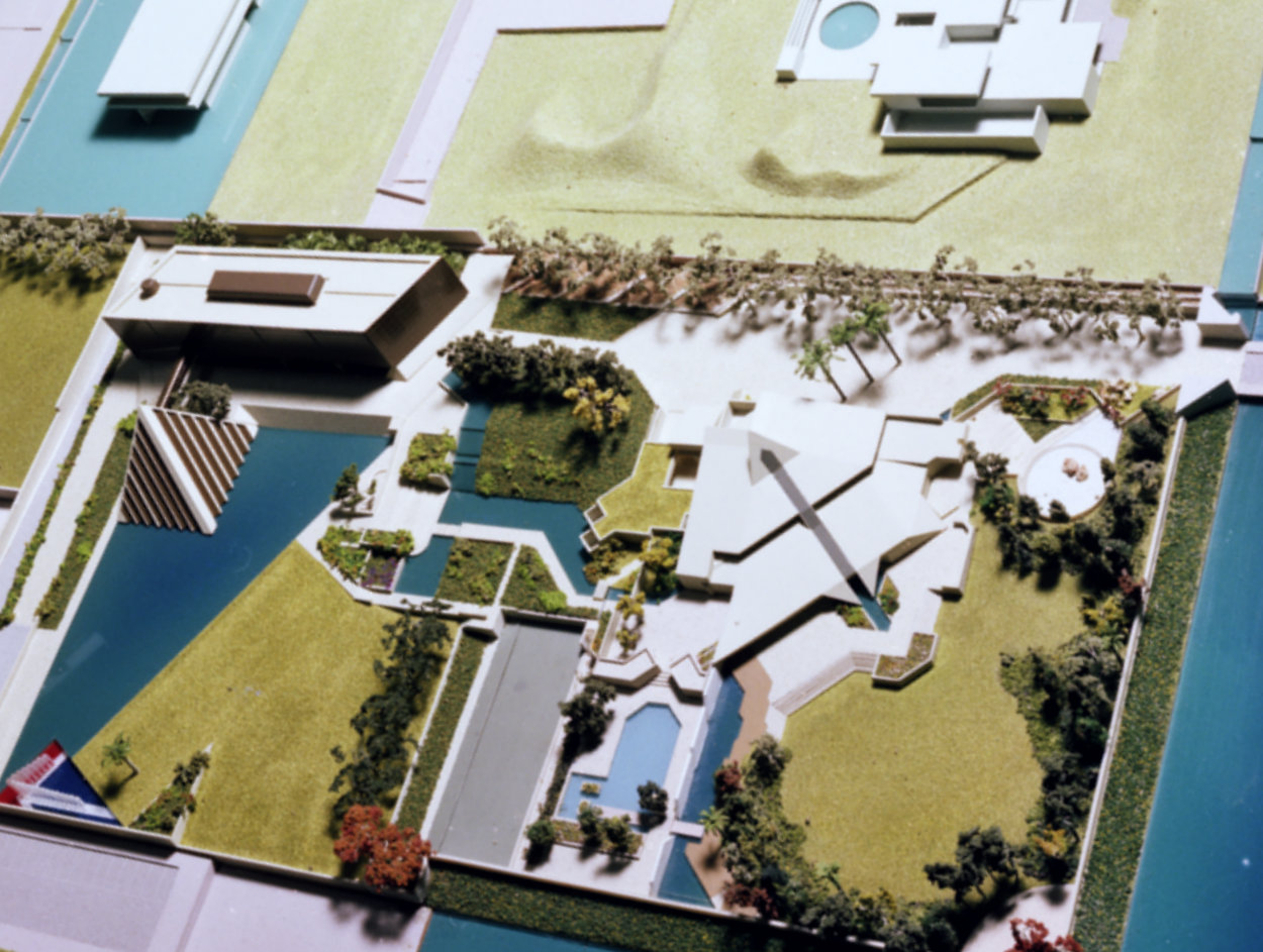 By 1974, permanent offices and a permanent residence on the main Avenida das Nações site had become high priorities. The PSA decided, with the FCO’s acquiescence, that both should be designed in-house and it appointed Alfred Coutts, a superintending architect in DEMOS (Directorate of Estate management Overseas), to lead a design team dedicated to this project. It began work in 1974, construction started on site started in 1980 and the buildings were occupied during 1983. They comprised a three-storey, fully air-conditioned offices block of about 2,500 square metres; a free-standing two-storey pyramid-shaped exhibition and function pavilion; an unusual residence of two floors beneath a large roof that reached down in places to the ground; and a range of ancillary buildings.