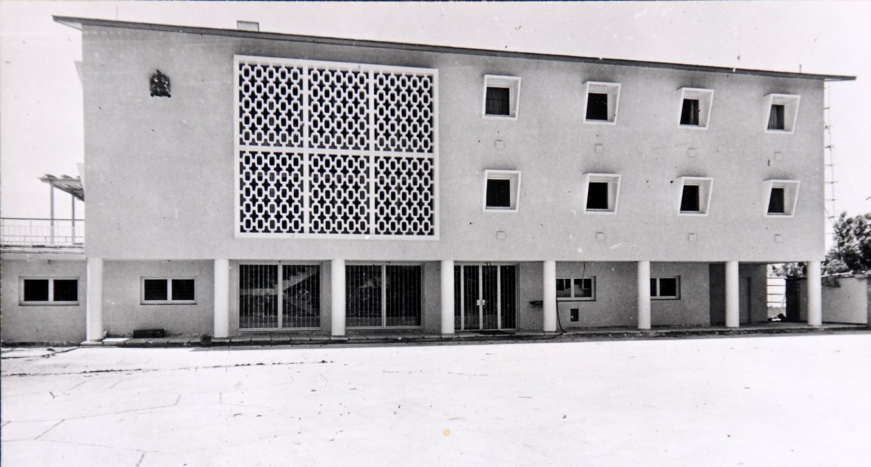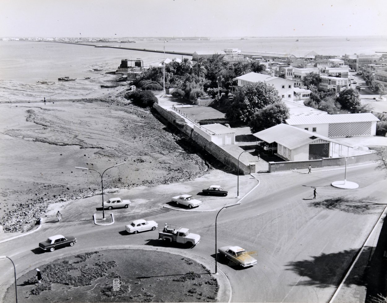 A two-storey agency building, with deep verandas all around both floors, was built with Government of India funds in 1902 on a three-acre site granted free of charge (and formally registered in 1953). A courthouse and ancillary accommodation was subsequently built on the same site. The agency building remained in use until its roof collapsed in September 1953. The Ministry of Public Building and Works demolished the rest of the building in 1955 and completed the following year a three-storey building on the same site, still on the shoreline, with offices on the ground floor and residence on the two floors above. The architect was William Bryant, and the building was built by directly employed labour (rather than by a contractor). The old courthouse was subsequently leased to the British Council. A strip of land along the shoreline was reclaimed from the sea during the 1960s, and in 1971 that part of the strip, comprising nearly two acres, that lay adjacent to the agency site was bought freehold, subject to restrictive covenants on its development, from the government of Bahrain for about £12,000: the new land became an admirable carpark for the embassy and British Council. The line of the old sea wall between the original site and the reclaimed land remained visible for many years [?still].