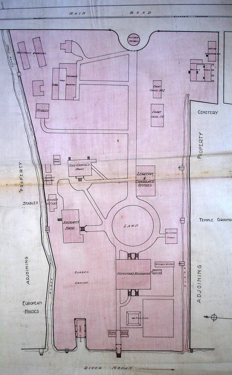 Charles Hillier, the first consul, arrived in Bangkok in 1856 and rented premises in the Bang Kholaem district of southern Bangkok. In 1857, King Mongkut gave the consulate a piece of land on the river, which was slightly enlarged soon afterwards to about seven acres. It was roughly rectangular, lying between the river at its west end and a muddy track at its east end, and with klongs (water channels) forming the two long boundaries with the Portuguese consulate to the north and temple grounds to the south.