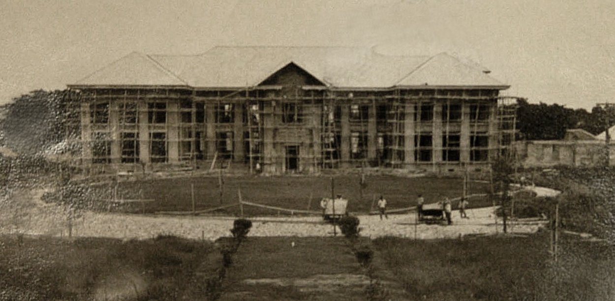 The first structure to be actually erected was a granite War Memorial, designed by the Aberdonian sculptor Sir James Taggart, and commissioned by a trust formed for the purpose in 1919: it was dedicated on 10 October 1922. The plans of the five main buildings were relatively easily agreed between Greg and Scott and their foundations were well in hand by August 1924. The main tenders for the superstructures of the buildings were received in November 1924 and the contract was let to Bangkok Dock Company Ltd. the following month. Some cost trimming was required, the most notable change being to lower the eaves of buildings C, D and E by a metre and thereby omitting the ‘frieze’.
