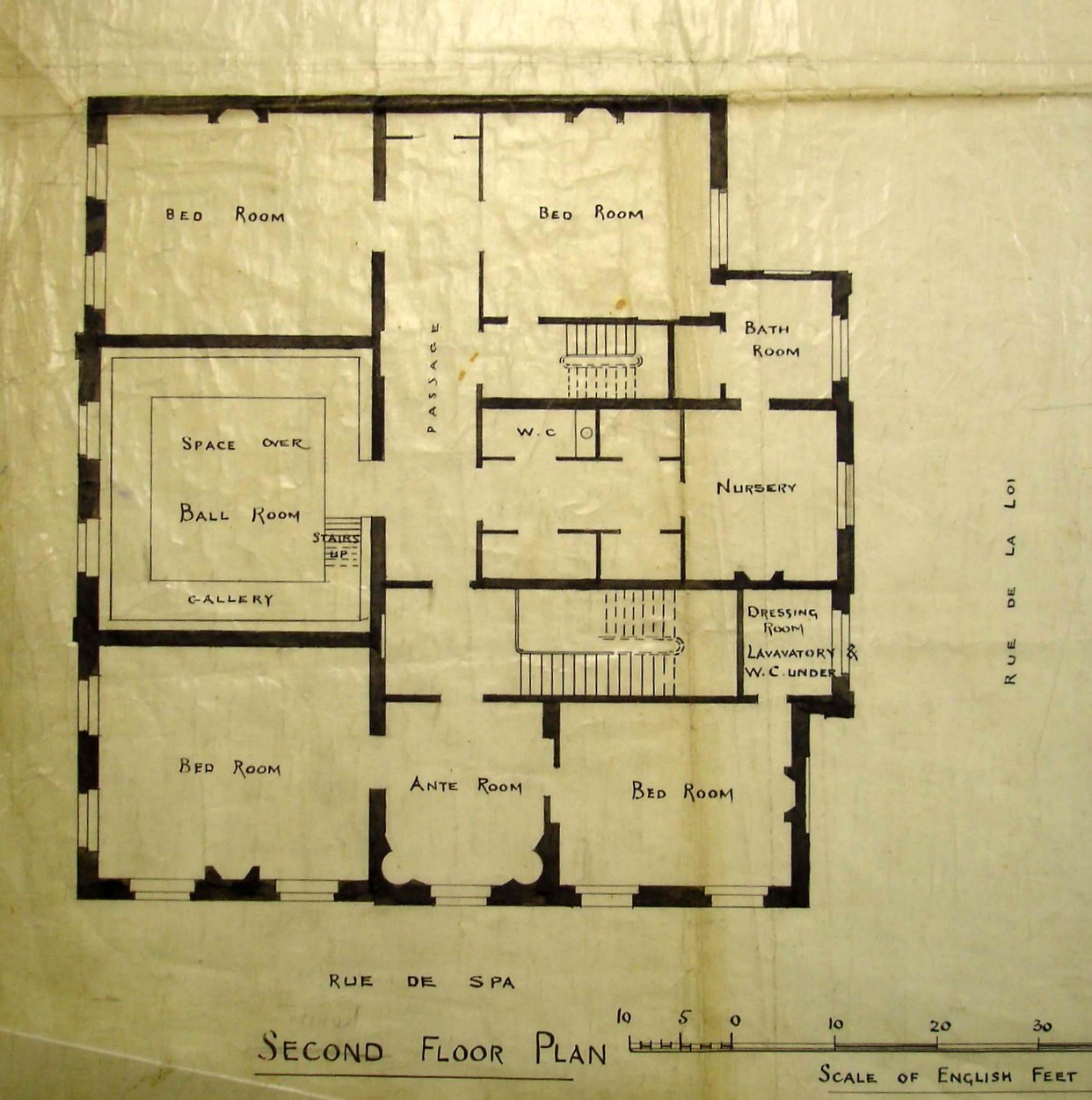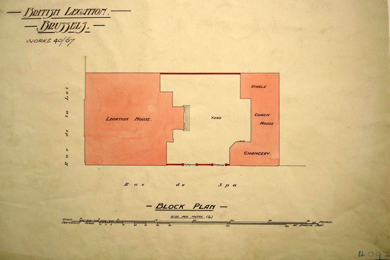 The Hotel de Rodes, on the corner of Rue de Spa and Rue de la Loi, which may have been leased by ministers before 1875, was taken on a ten-year lease by the Office of Works in 1875, and bought for about £14,000 in 1887. The courtyard was entered from Rue de Spa: on the left stood the three storey house, almost square in plan, and on the right a range of outbuildings used for stables, coaches and chancery. This building served as the mission house until the Second World War, when the embassy was evacuated.