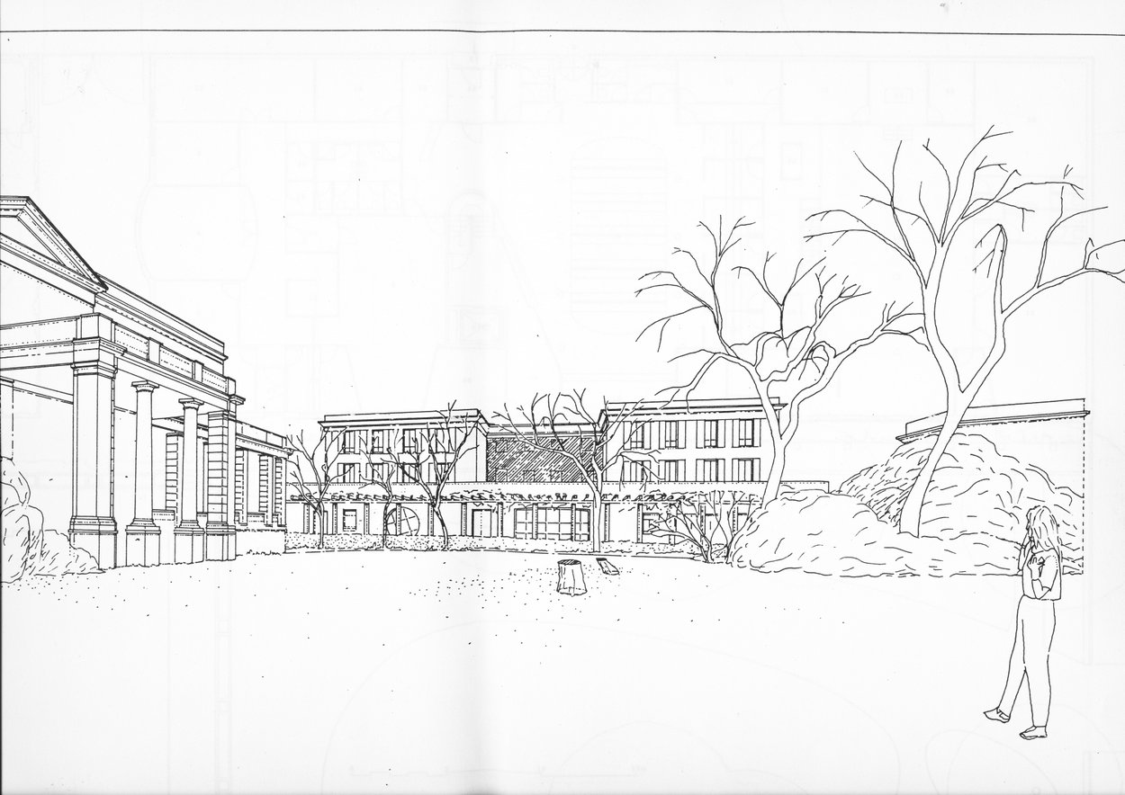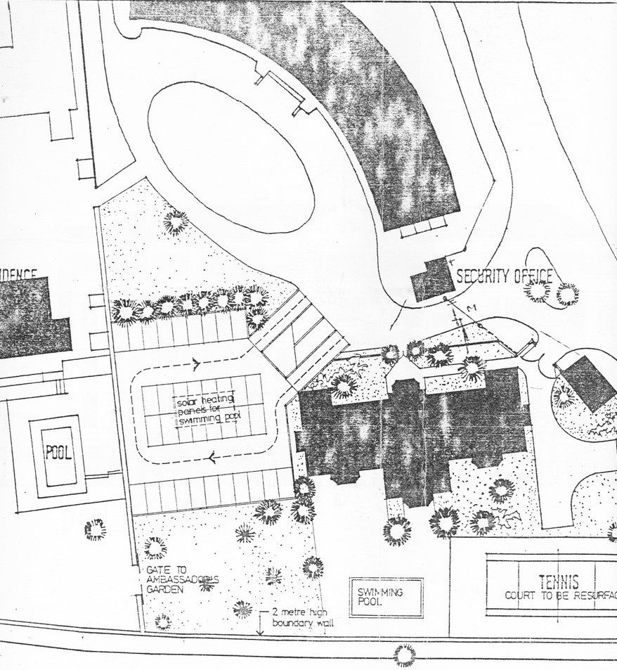 During the 1980s, the FCO (having won responsibility for the overseas diplomatic estate from the PSA in 1983) sought acceptable ways of making better use of the compound. In 1986, Seifert International, architects, was commissioned for a sketch scheme for a free-standing block of 11 UK-staff flats near the middle of the compound. The result was a scheme on five floors but the idea was suspended in the face of severe Post objections, including to the loss of the rose garden (formerly the site of the Bacos building). This failure was followed by the appointment in 1988 of Jeremy Dixon, architect, to suggest how a residential accommodation scheme might best replace the ballroom. There was no clear wish to demolish the ballroom but it was short of a relevant role and rather wasted a site that could perhaps be put to more productive use. Dixon produced a restrained and elegant design for a three storey building with visa and consular offices on the ground floor, and three flats on each of the upper floors. This scheme, and indeed the whole idea of putting offices and staff on this corner of the site, eventually failed for security reasons.