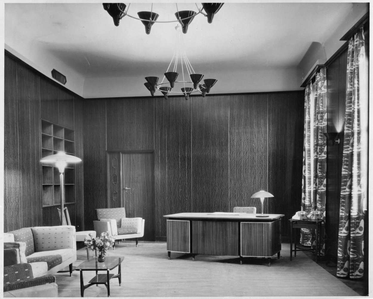 The Foreign Office first asked the Ministry of Works for new offices in 1946. The Ministry provided plans in 1948, hoping that air -conditioning would not be necessary. The case was submitted to the Treasury and remained under discussion for nearly a year before the Foreign Office agreed in 1950 to manage without air-conditioning. Revised plans were ready in November 1950, and the new chief architect, Eric Bedford, approved the elevations in February 1951. The Treasury agreed to an estimate of £162,500 the following month. The building was of four storeys, with a double-banked centre corridor on each floor, curved in plan in response to the curved site perimeter and to avoid the prior demolition of the offices in the Bacos building. An enabling contract was let for the provision of some temporary offices, steel for the foundations was ordered early from UK, and tenders were issued in November 1951, only to be withdrawn in the light of political tensions in Egypt. The process resumed in 1953 but uncertainties continued while the plans of the building were changed to include offices for the consulate-general staff from their Rue Gameh Charkass building in town. The final decision on air-conditioning was that the building should be designed for its later introduction [true?]. Construction eventually started in early 1954 and the building was occupied in late 1955. The ambassador’s office moved across from the residence. The ambassador at the time, Humphrey Trevelyan, recalled that the building was “designed soon after the Festival of Britain, with every wall flaunting a different colour and ostentatious reproductions of the royal arms picked out in white on the front of the ambassador’s desk.”
