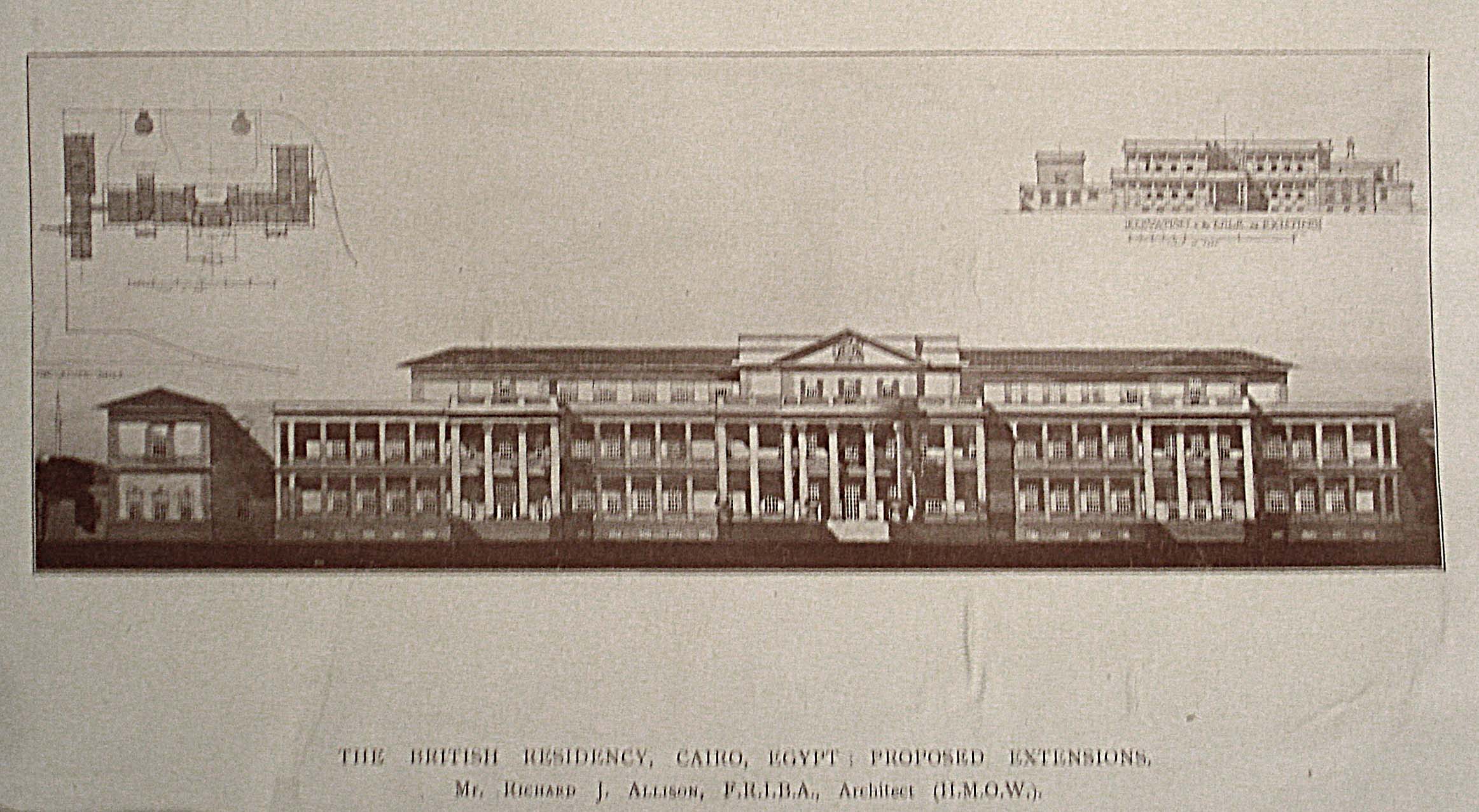 Despite its purchase, the building lay vacant throughout the rest of the War. After it, instead of looking to the awkward Bacos building to cope with a staff that had grown to 40 (from 7 pre-war), 13 of whom were occupying the ballroom, Allison designed a huge scheme in 1919 that extended the existing building southwards across the whole of the Bacos plot (requiring the demolition of the half-completed structure on it), such that it became two and a half times as long as the residence. Allison also brought a wing forward from the ballroom towards the Nile, and pushed one back, away from the Nile, at his new south end. The whole was elevated and detailed in much the same manner as Boyce’s 1890 building, although Allison minuted on 4 July 1919 that ‘The long facade to the Nile should in my opinion be designed on more impressive lines than the existing somewhat commonplace and uninteresting structure’. Allinson’s drawing of the elevation to the Nile was exhibited at the Royal Academy in summer 1920 and was published in The Building News in February 1921. The proposal was actively supported by the Board of the Office of Works and by the high commissioner, by then Allenby. But the estimate of £135,000 was simply too much for the Treasury to contemplate in hard times, and Allison’s grandiose proposal was finally set aside in August 1922.