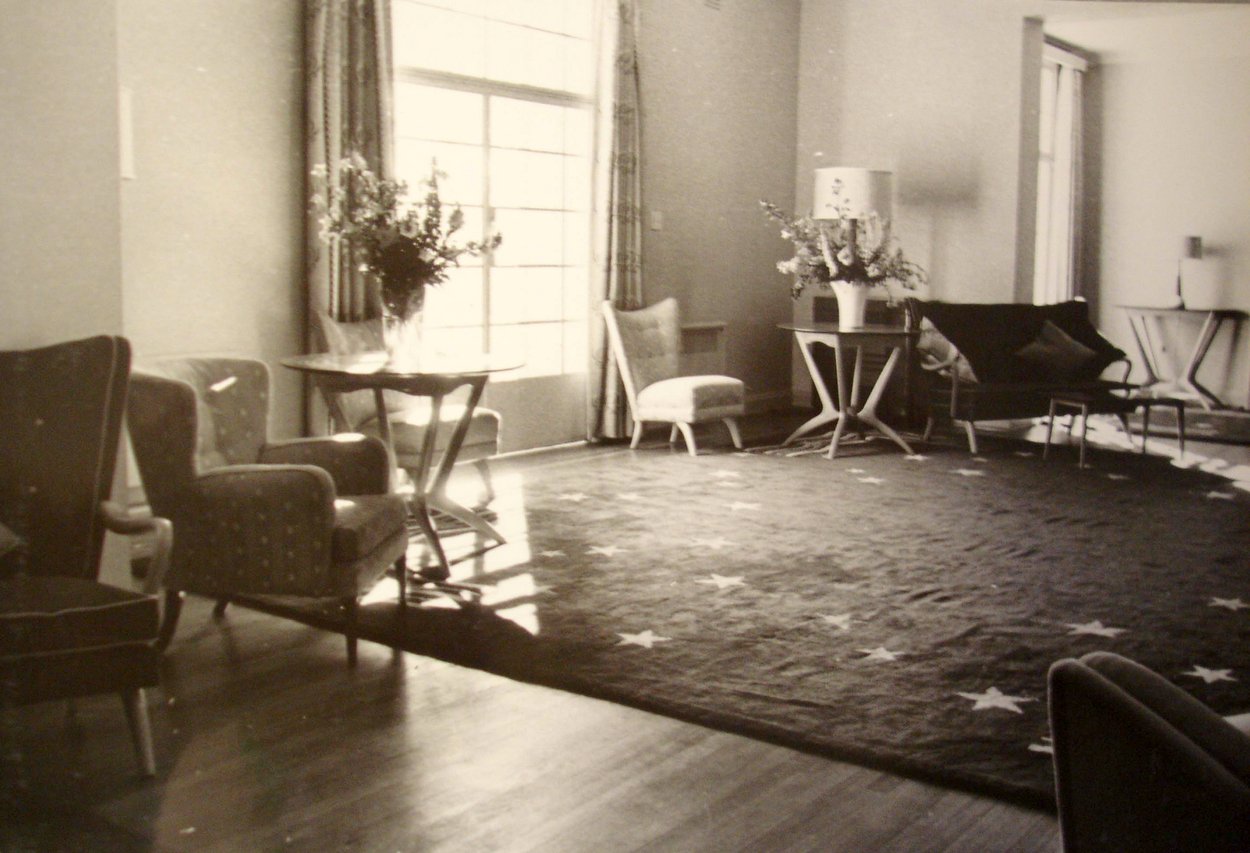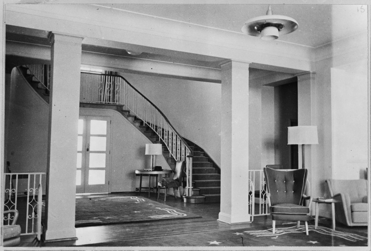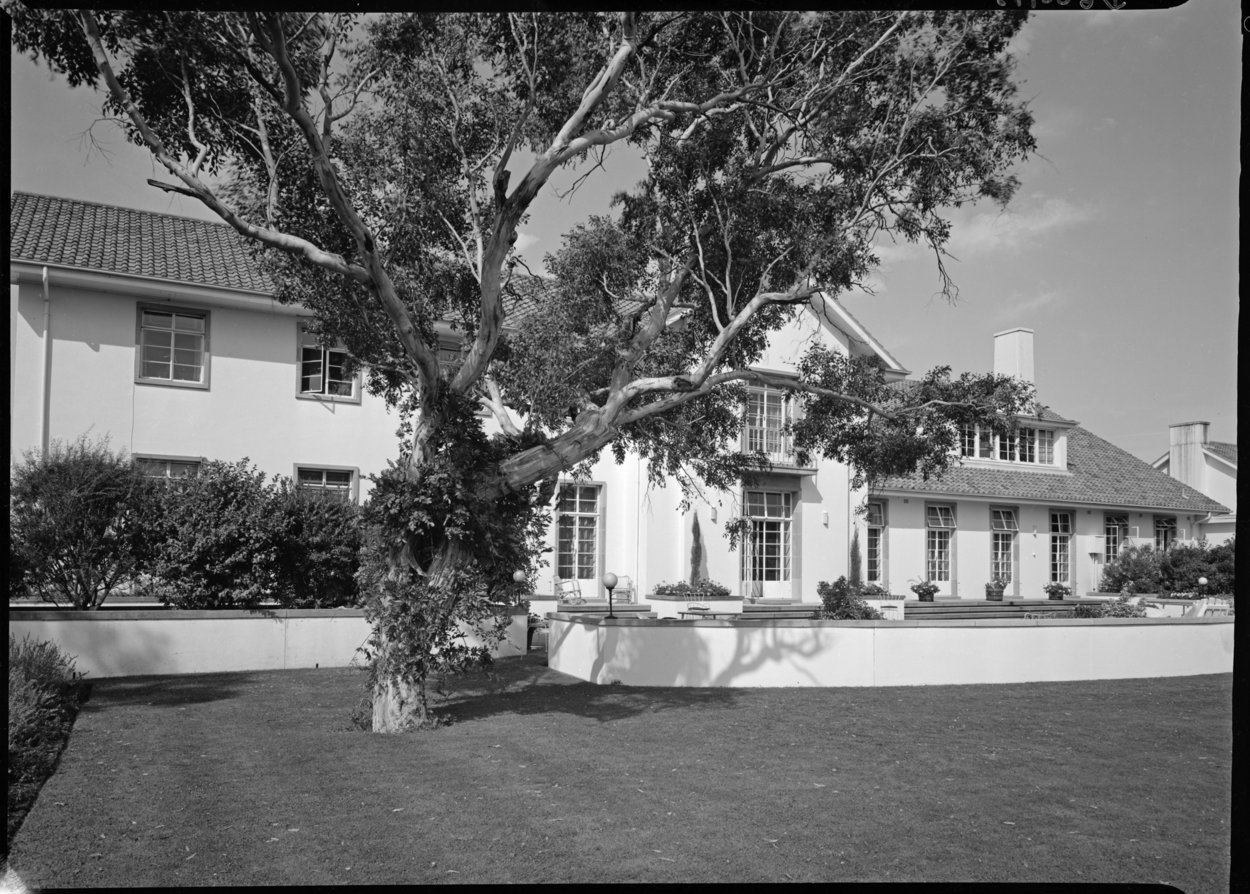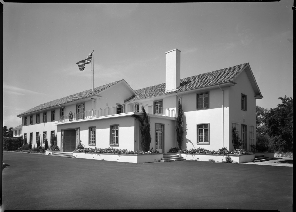 The site selected in 1949 for the residence, of rather over 1.8 hectares, was in Deakin, then one of the highest residential areas in Canberra and just outside the designated diplomatic area. The Crown lease was for 99 years from July 1951. The intention was to build residences for both the high commissioner and his deputy on the site but a gardener’s cottage soon superseded a house for the deputy, who went on living at 42 National Circuit, Forrest, which had been leased since 1926. The Ministry of Works, doubtless to avoid any risk of another over-the-top residence like the one recently completed at Rio de Janeiro, excluded the outline design of the Canberra residence from its architectural commission to Scott. The design, the first for a residence after the Second World War, was entrusted to Alexander, who proposed a long, thin, low-key, two-storey building along the top of the ridge. The high commissioner, Sir Stephen Holmes, moved into the new residence, again named Canberra House, on 24 October 1953.