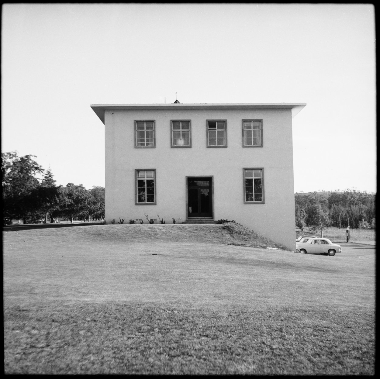 The site for the offices, just over 0.8 hectare, was at Yarralumla Section 43, within the area designated for diplomatic buildings on Commonwealth Avenue, the main roadway between Capital Hill to the south and the commercial centre to the north. Scott, the architect, completed here in 1952 a two storey rectangular block facing Commonwealth Avenue, with the fall of the site permitting three storeys at the rear. He made provision for a later rearwards extension, at right angles to the avenue, to house the Service Attachés who were expected eventually to be transferred from Melbourne. This extension was built in 1960. In that year, also, the first lease on the site was converted to a 90 year Crown lease to make it co-terminous with the residence site lease.
