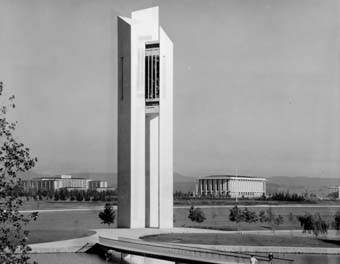 It was announced in Canberra in March 1963, in the presence of HM The Queen and on the 50th anniversary of the start of building the city, that the British Government would offer, as a gift, a significant contribution to the development of Canberra to reflect the common Parliamentary heritage of the two countries. Four years later, it was decided that the gift should take the form of a carillon and belltower, to be erected on Aspen Island in Lake Burley Griffin. The Ministry of Public Building and Works organised a limited design competition between six architects, three recommended by each of the two Royal Institutes of Architecture. The competition was won by Cameron, Chisholm and Nicol of Perth, Australia. The National Capital Development Commission built the foundations for the belltower and the access bridge to Aspen Island; Dillingham Constructions Pty Ltd built the 160ft high tower, under the supervision of an MPBW clerk of works, Geoff Toomer; MPBW’s Supplies Division managed the manufacture of the 53-bell carillon; and John Taylor & Co of Loughborough cast the bells in bronze. HM The Queen opened the National Carillon on 26 April 1970.