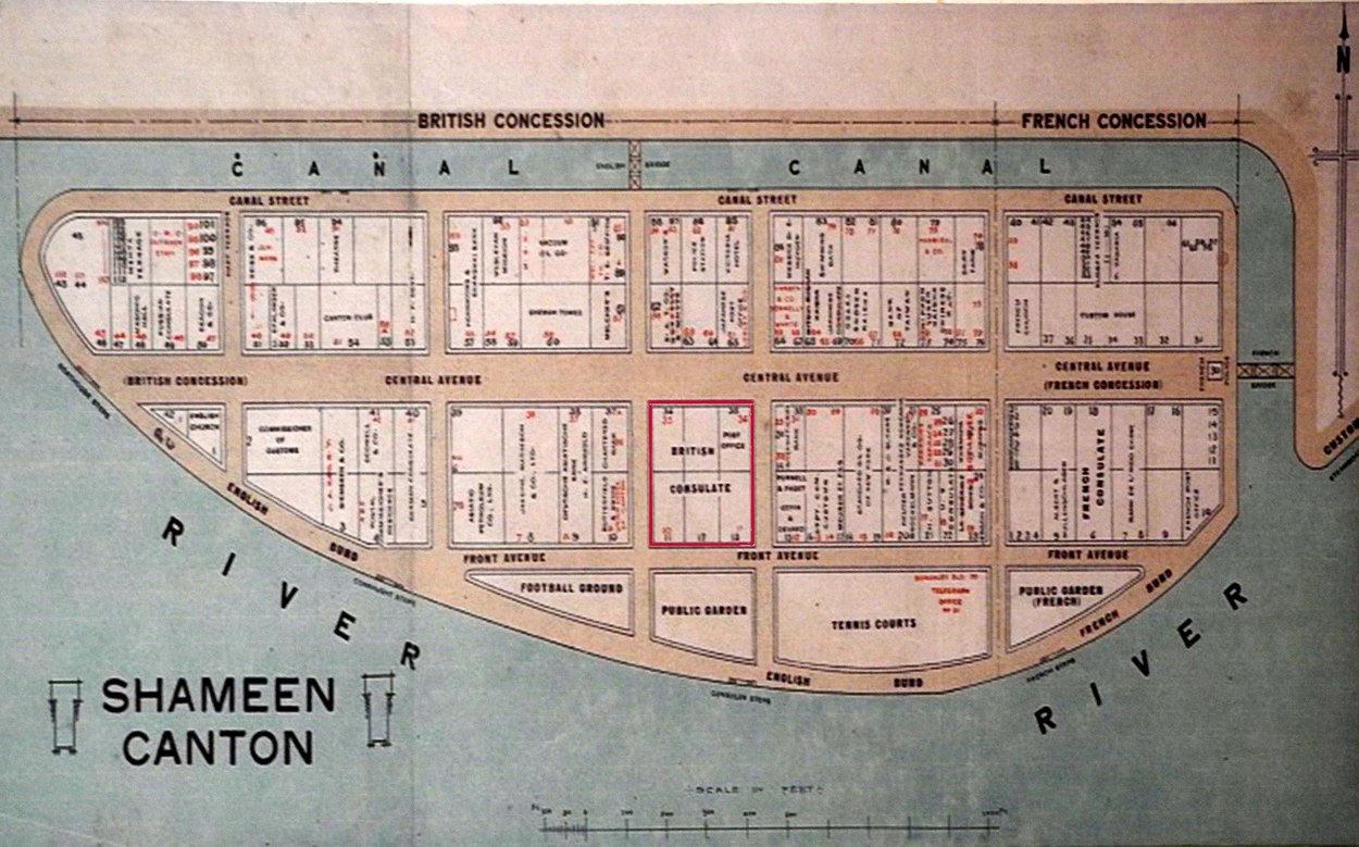 The British consular buildings were designed and supervised by Charles St George Cleverly, then surveyor-general of Hong Kong, and built in the early 1860s around three sides of a court, with a large grass lawn, that was open on the fourth (south) side to the Bund. Across the north of the site came a large building with the offices on the ground floor and three apartments for assistants on the first floor. DOMINE SALVUM FAC REGEM – O Lord, Help the King – was inscribed across the entrance to the offices off Central Avenue. To the southwest was the consul’s house, and to the southeast the vice-consul’s. The constable’s quarters and gaol were in the northeast corner. The rest of the compound perimeter was given over to servants’ quarters. Since the consul himself did not live at Shameen (see Other Accommodation below), his designated house in the compound was let to the Imperial Customs.