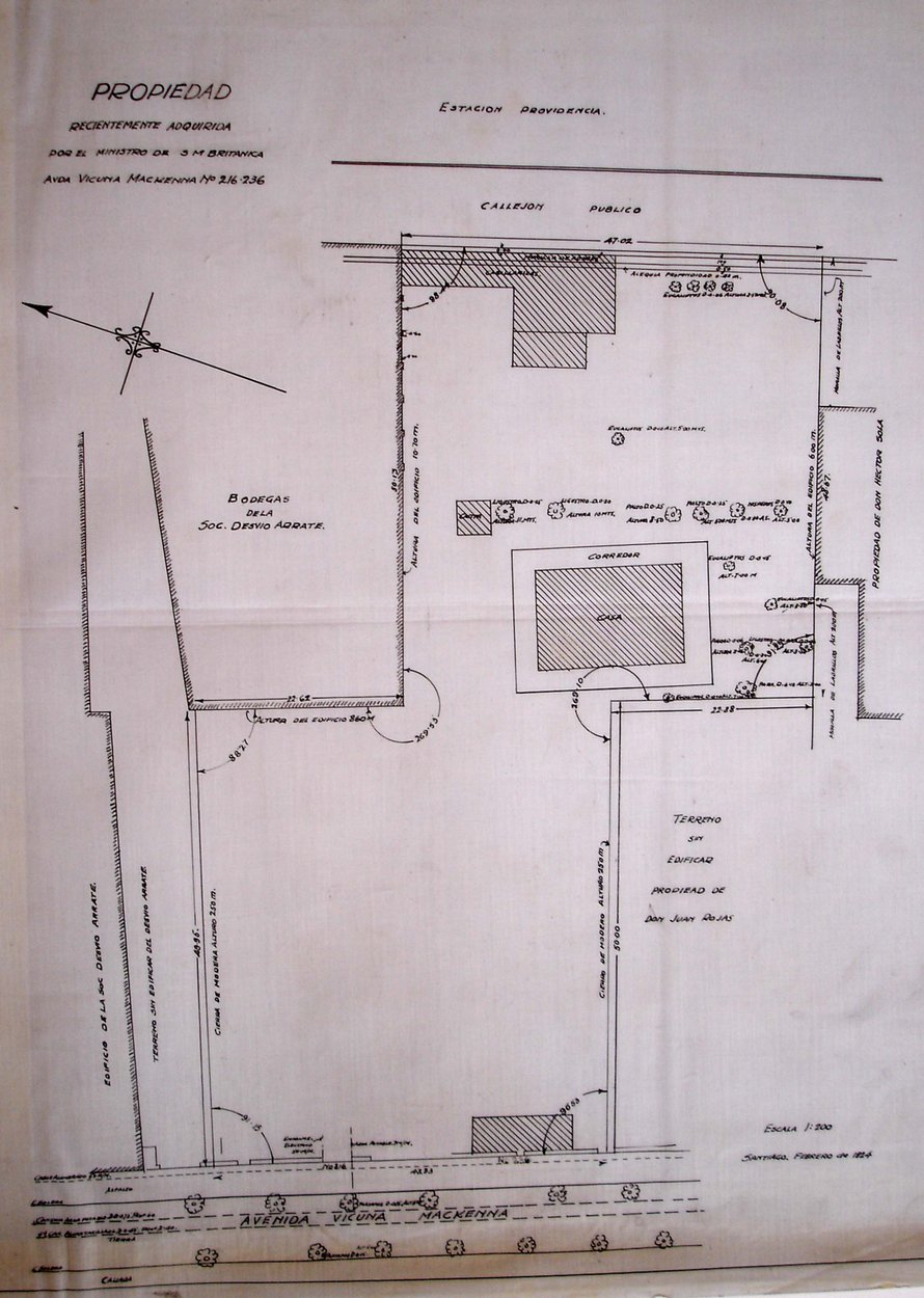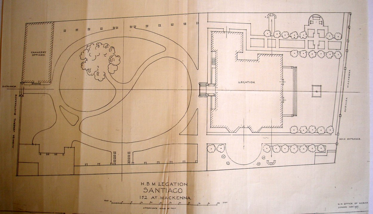 Cecil Simpson, a senior architect in the Office of Works, was tasked to find a new legation building at Santiago during his 1924 tour of South American Posts. He could find nothing suitable to buy or lease, so he had to fall back on looking for a site to buy and build upon. The best he could find was three contiguous properties at 216-236 Avenue Vicuna Mackenna, comprising in all about 0.5 hectare, being used at the time as sawmill, timber storage yard and wheelwright’s cottage. With the support of the minister, Grant Duff, he bought this site for £12,800, and immediately sought covering authority from London, which was forthcoming. Simpson judged that this location, though not ideal, was not too far from the business district also to house the chancery and commercial secretary’s office. There was some urgency because the lease on the present house in Calle Claras would expire in May 1925.