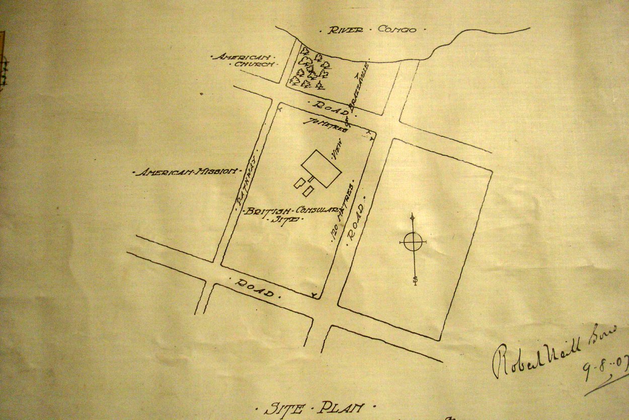 A consulate site of 34 acres, triangular with its base along the shore of the river, was bought in 1902 for £700. A three room prefabricated timber-framed bungalow, by Messrs R. Rogers and Co. was sent from Britain in 1903 for erection on concrete stilts (which provided an open lower floor). An employee, Alex Robertson, of the makers was sent as foreman carpenter and clerk of works to supervise construction. The site selected was on the fifty foot contour, and the cost was £3,400. A landing stage and a shelter for the consulate’s river launch were built at the river’s edge.