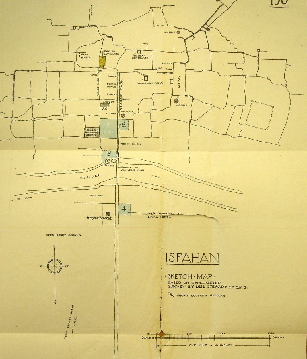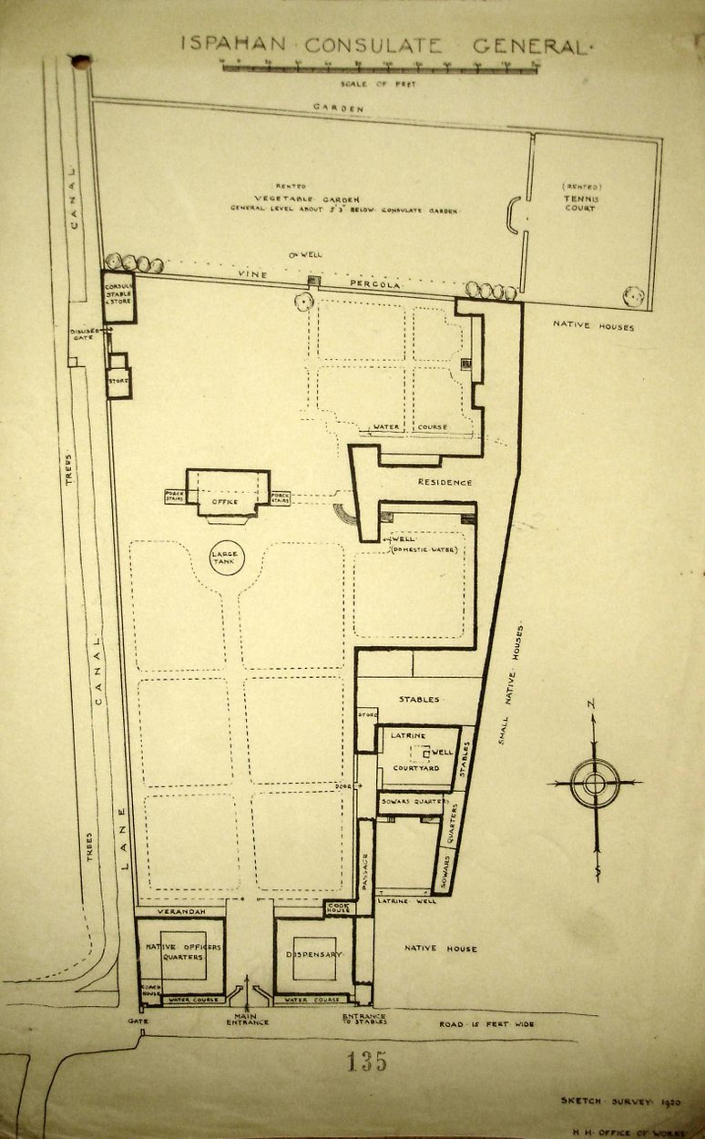 The first consulate was established in this house in 1841. The house had originally been confiscated by the Persian government but was later [?when] restored by royal decree to the family of the original owner, who sold it to a British subject, Dr McCormick, whose family continued to lease it to the British consulate. The lease was renewed for 21 years in 1897 and then annually from 1918. By this time the lessor was Mrs Louisa Hakoumoff of 19 Chatsworth Gardens, Acton Hill, London W. She died in 1920 by which time the building was by ‘in the midst of unsanitary and undesirable surroundings’ and the intention was to buy a site and build a new vice-consulate. The property was finally surrendered in 1926, when the consulate moved into leased premises.