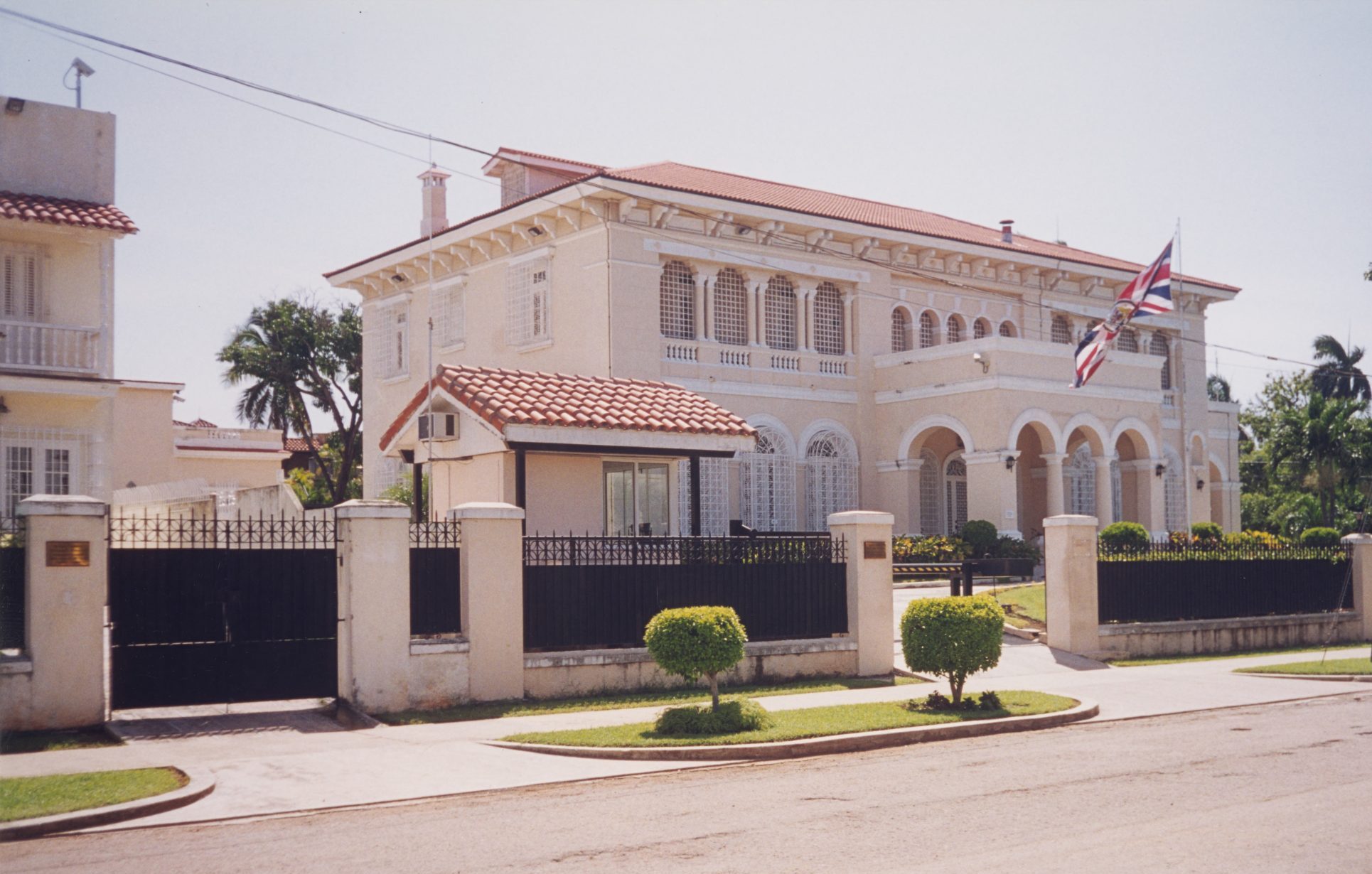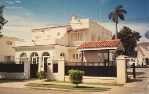 In 1949, several dispersed offices were brought together on the top floors of the Bolivar (formerly Galban Lobo) Building at 101-03 Calle Capdevila, a then-new ten-storey residential block, well located overlooking the harbour. The embassy eventually had storage on the 7th floor, offices on the 8th and 9th, and a security officer’s flat on the 10th. Both the block and the district deteriorated quickly, so that by the early 1980s the health and safety conditions, and above all the fire escape arrangements, were so unsatisfactory that the embassy had to evacuate the building in 1993 and move into temporary offices in 708 Calle 34, Miramar. The Cubans offered promising alternative premises for lease in two two-storey villas on one 0.27 hectare site at 702-704 Calle 34, Miramar.The Cubans paid for the work necessary to bring the villas into reasonable condition and the FCO for their conversion to embassy use. The work was completed in 1995. Chancery and commercial section occupy the larger, older and better-looking villa; consular and management sections the other.