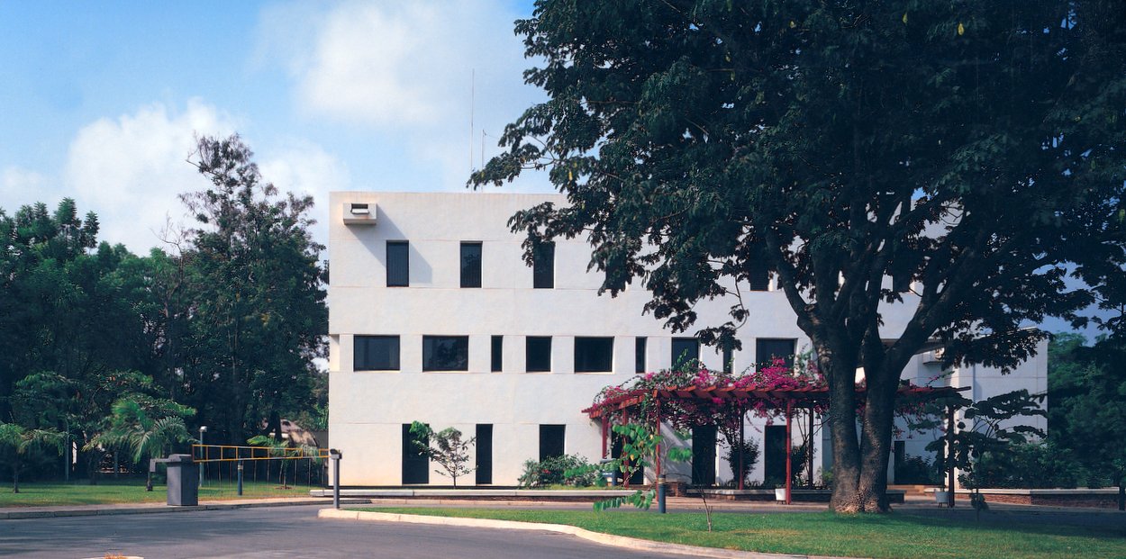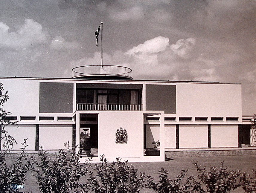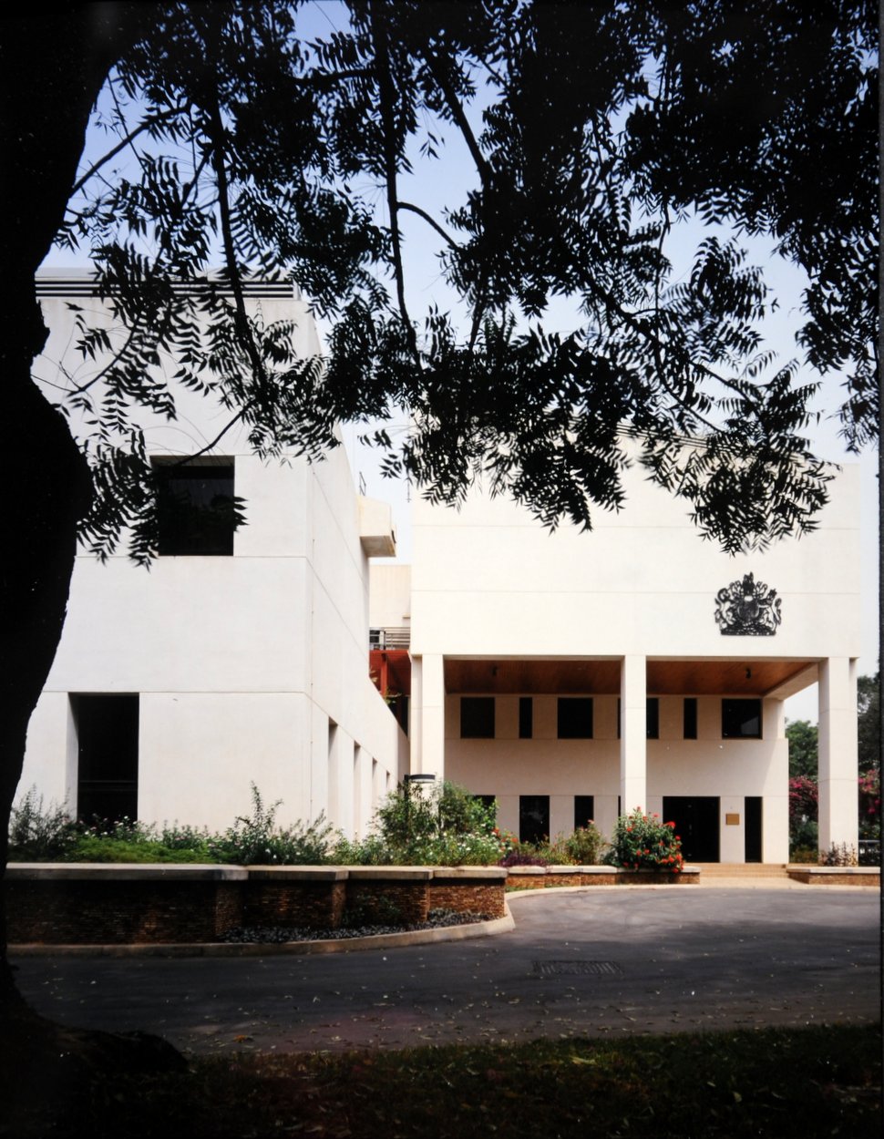 Offices for the High Commission were leased for 21 years from 1959 on two floors of the Barclays Bank Building, on High Street. By the early 1980s, these had become too run-down, and the consular and immigration offices were out-housed in two converted houses on the Tema Ring road, four miles awy. A 50-year ground lease, with an option to renew for a similar period, was therefore taken in 1984 on Plots 25 and 27 Gamel Abdul Nasser Avenue, together comprising about 3½ acres. A new building to accommodate all the offices, designed by John Watts, an in-house PSA and later FCO architect, was completed here by Taylor Woodrow International in 1986. An extension to the visa section was completed in 1990. [? and another annex across the road.]