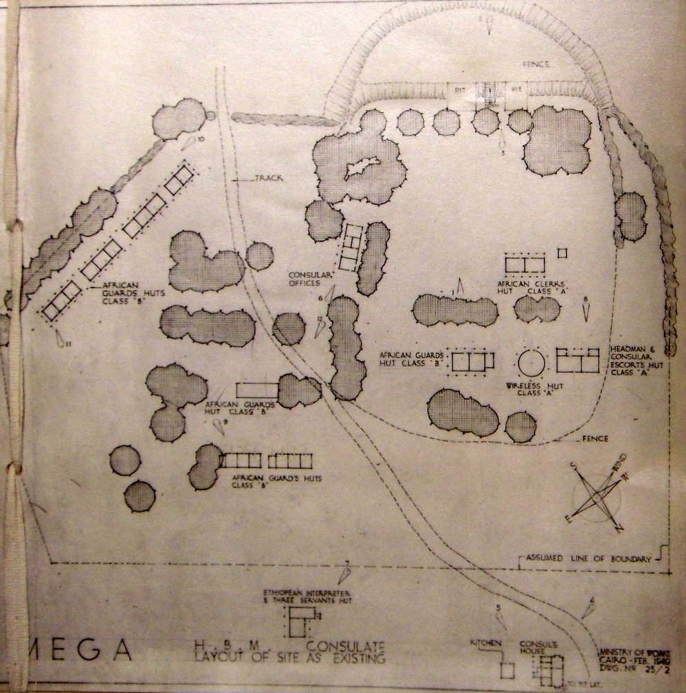 Mega lies on an escarpment in south Ethiopia close to the Kenyan border, about 650 kilometres south of AddisAbaba. Eight acres near the top of the escarpment at 7,300 feet were allocated (without title deeds) to the consul in 1917 by the governor of Borana. Scattered huts grew up in the compound and the Italians, who occupied it for a period before 1941, built a shoddy house that became the consul’s residence once the post re-opened. In 1947, responsibility for the consulate passed from the Colonial to the Foreign Office. The whole compound was in a dreadful state and its reconstruction was quickly agreed: a Treasury official even said ‘I was interested in the photographs and, certainly, it is not necessary for you to add anything to them in the way of a case for making an improvement at Mega”. The Office of Works in Cairo produced a workmanlike reconstruction scheme and saw it through to completion in 1952, using direct labour and importing simple materials through Kenya. The post closed in the early 1960s [what happened to the compound?]