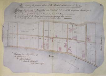 The concession area at Kiukiang, negotiated by Harry Parkes in 1861 on the bank of the Yangtze River and just outside the city walls. The consulate site is on the Bund, and marked pink.