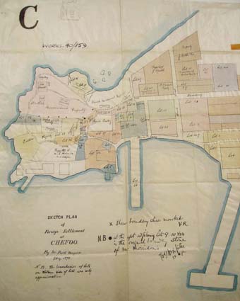The Foreign Settlement at Chefoo in 1872: the pink triangle at upper left is the British consular compound. (North is to the left.)