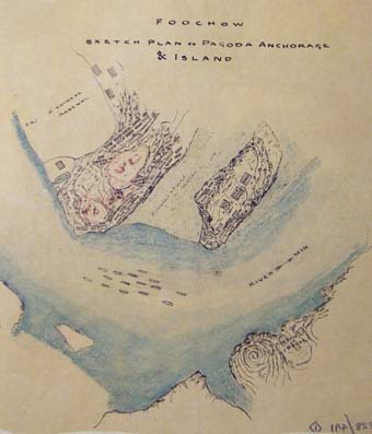An 1870 sketch of the Pagoda Island anchorage. Boyce built a bungalow for the vice-consul on the bluff at left in 1872.