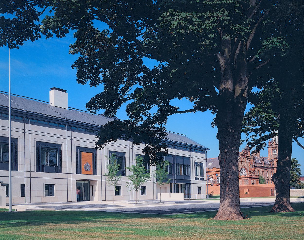 The pressures for a new embassy that would be both secure and capable of bringing all the offices into one building were increasing during the 1980s. In 1987 the FCO was able to buy for this purpose 29 Merrion Road, the 2.4 acre site next to Ardoyne, from the Royal Dublin Society. In 1990, the architectural practice of Allies and Morrison won the limited design competition with an elegant and calm building, which was completed, by Pierce Contractors, in 1995, and opened by HRH The Princess Royal. Nos. 31 and 33 Merrion Road were sold shortly afterwards.