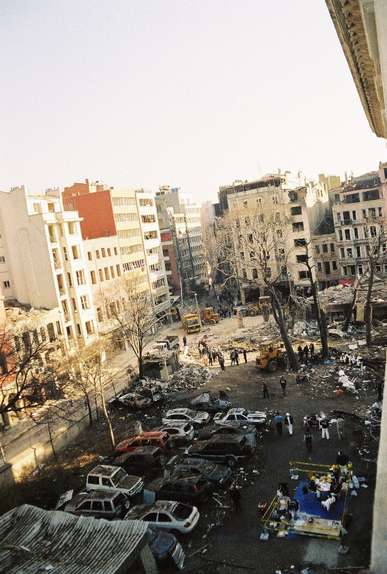 The present century started horrendously for Pera House. A long-overdue refurbishment was nearing completion when, in May 2000, the building was once more severely ravaged by a fire. [How started?] The consequent extensive refurbishment contract was itself nearing completion when the building was blasted by a large car bomb placed just outside the gateway in November 2003. The consul-general, Roger Short, and his personal assistant, Lisa Hallworth, who were working in temporary offices in the gatehouse, were killed instantly, and eight members of the locally-engaged staff also died. [Did Pera House walls shift?]