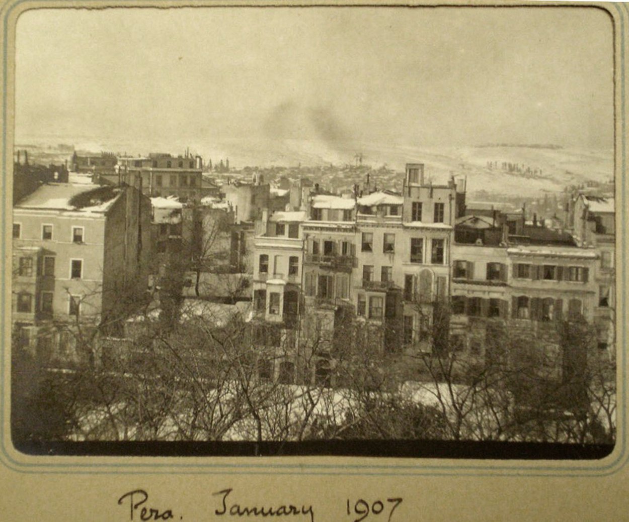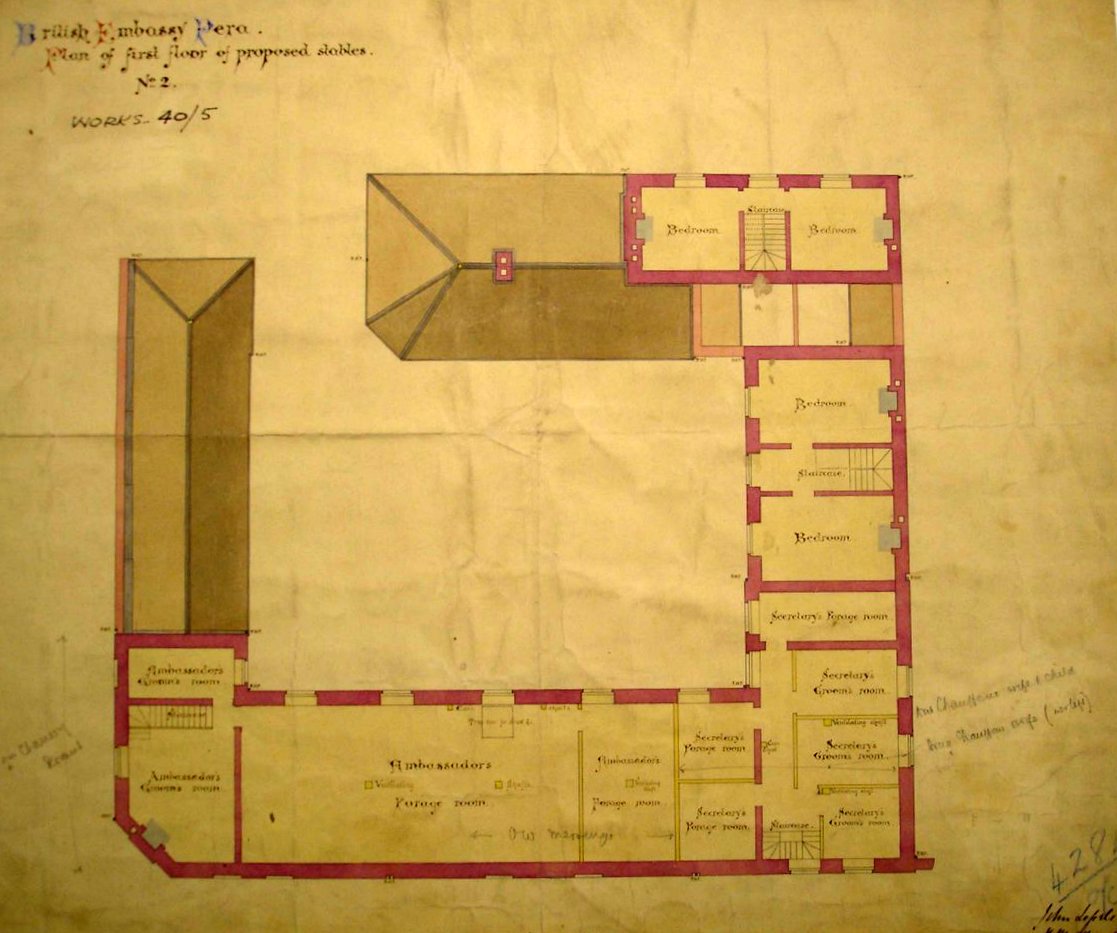 The Pera embassy house was considerably criticised by successive occupants in the early years after its completion in 1856, and had required a good deal of maintenance, especially to leaking roofs. Another fire in June 1870 caused significant damage. Sterling efforts by the crew of HMS Antelope, a visiting paddle sloop, in helping to fight the fire eventually succeeded in containing it and saving the archives and plate. The Office of Works, smarting from being usurped in 1866 by a direct Treasury appointee in Constantinople, primly sought to distance itself: ‘… this Board is not responsible for, and has no duties to perform, in connection with [this building], with the exception of an examination as to the arithmetical correctness of the quarterly accounts sent to their Department by the Treasury’. Nevertheless, the ambassador, Henry Elliot, suggested that someone from the Office of Works should survey the damage.