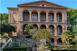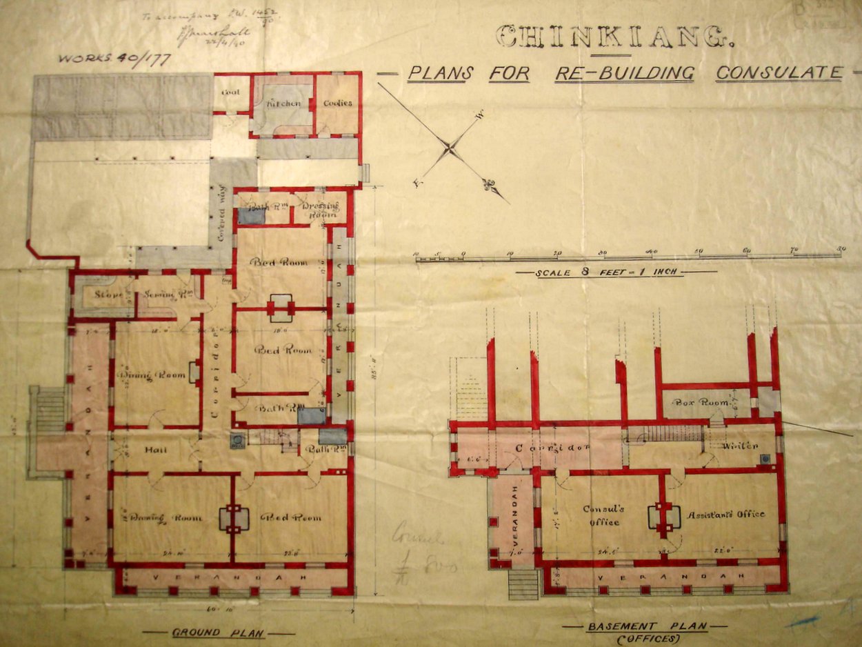 A river port about 150 miles from the mouth of the Yangtze, at the mouth of the Grand Canal. Designated a treaty port by the Treaty of Tientsin 1858, a Post was established here in 1861. A concession area, selected by Parkes, was leased to Britain, lying along about 450 yards of bund on the south bank of the Yangtze. It was developed with two parallel inland roads, and divided into 19 lots. Parkes reserved a site of about 2¾ acres, enclosed by brick walls and covered with trees and shrubs, for the British consulate on a hillside immediately south-west of the concession area. The consulate’s first accommodation was in part of a Buddhist temple, for which the priest refused to accept rent, at the northern edge of this site. A consul’s house on one floor with offices, because of the slope, below it at the front and entered at the lower level, and constable’s quarters, all designed by Boyce, were built in 1873 on the reserved site. Both these buildings were looted and burned down during a local riot in February 1889 and the consulate moved temporarily into a large foreign house. They were rebuilt, with some adjustments, by Marshall in 1890, and with some compensation from the Chinese government.