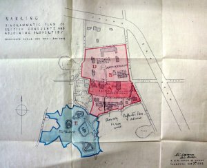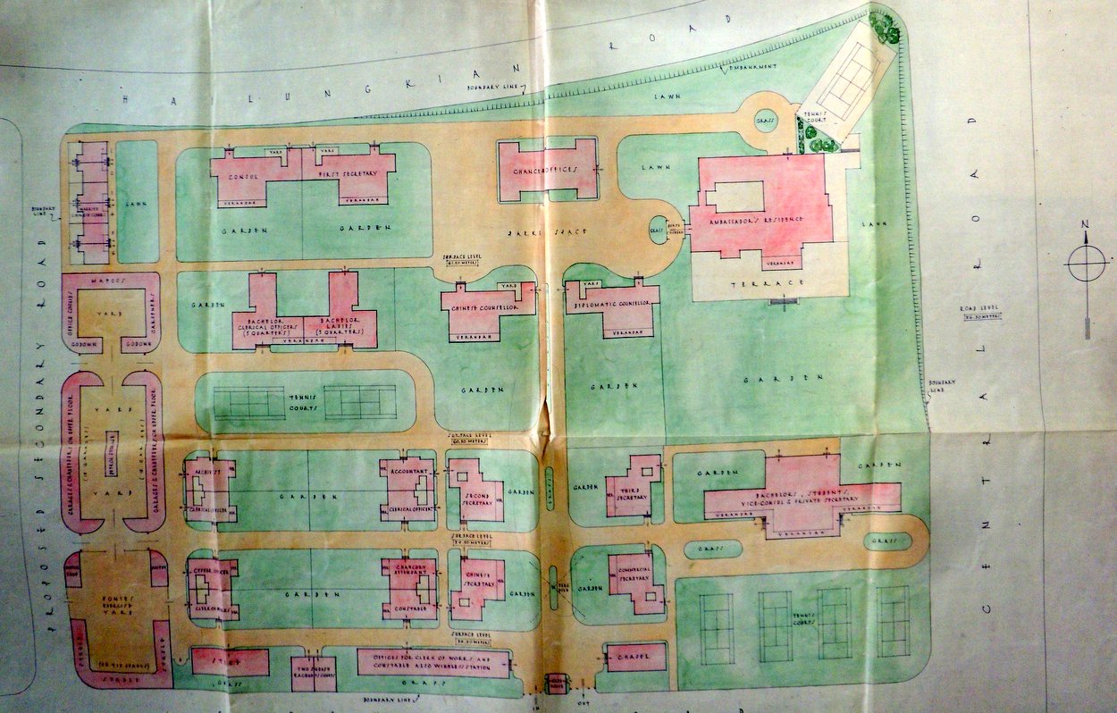 The new ambassador in 1936, Knatchbull-Hugessen, decided to base his embassy at Nanking rather than Beijing, and in 1937 the Treasury gave approval to buy for £15,700 a perpetual lease on a 100 mou site (16 2/3 acres) in the 6th Division of the municipality on which a new British embassy could be built. The address of the site was Tzu Chu Lin [is this the same as Ge Gok Ling?], at the corner of Central Road and Heilungkiang Road: there were a couple of small buildings on it at the time. But only the title deed was signed, and numerous drawings for the compound layout prepared by Wynnes, before the embassy moved with the government from Nanking to, successively, Shanghai, Hankow and Chungking. The Japanese occupied Nanking in December 1937. During the Japanese war, Chinese military and air force units occupied the site, erecting buildings and aerials, and they never left. The site was compulsorily re-acquired by the Chinese in 1958 [?] for £183, the assessed value of a house still standing on it.
