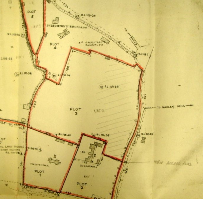 Indian Independence in 1947 meant that Britain and India needed to settle between themselves (and India with Pakistan) an equitable division of the compound for what would now become their new and separate embassies. The result, which took seven years of (sometimes fractious) exchanges and rival proposals, was that most of the 1816 compound, including its relatively recent main legation buildings, would pass to the Indians, leaving to Britain only an awkward area with two staff bungalows on it and the site of the British Cemetery. This was insufficient space for building a new embassy but the Nepalese government indicated that it would be prepared to sell an adjacent 7 acre piece of land to the Ministry of Works for £11,000. In that expectation, the Ministry commissioned designs for embassy offices from the architectural firm of Tripe and Wakeham (who proposed a small curved block) and for a residence from one of its own senior architects, Gordon Alexander (who proposed a junior version of his own (built) design for Canberra). Neither was viewed with favour but the site was nonetheless purchased in 1954. It comprised three plots: a British post office, a vacant area; and a European house called Forest House, built for (and designed by) a former Forest Adviser to the Nepal Government, Evelyn Smythies, in the very early 1940s.