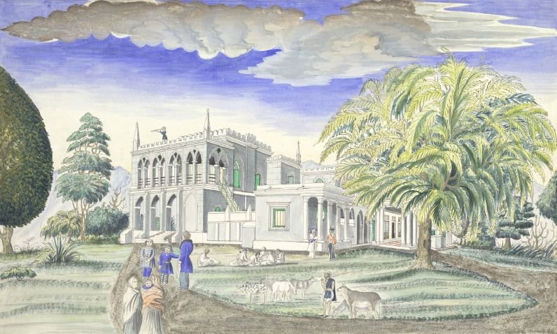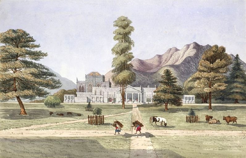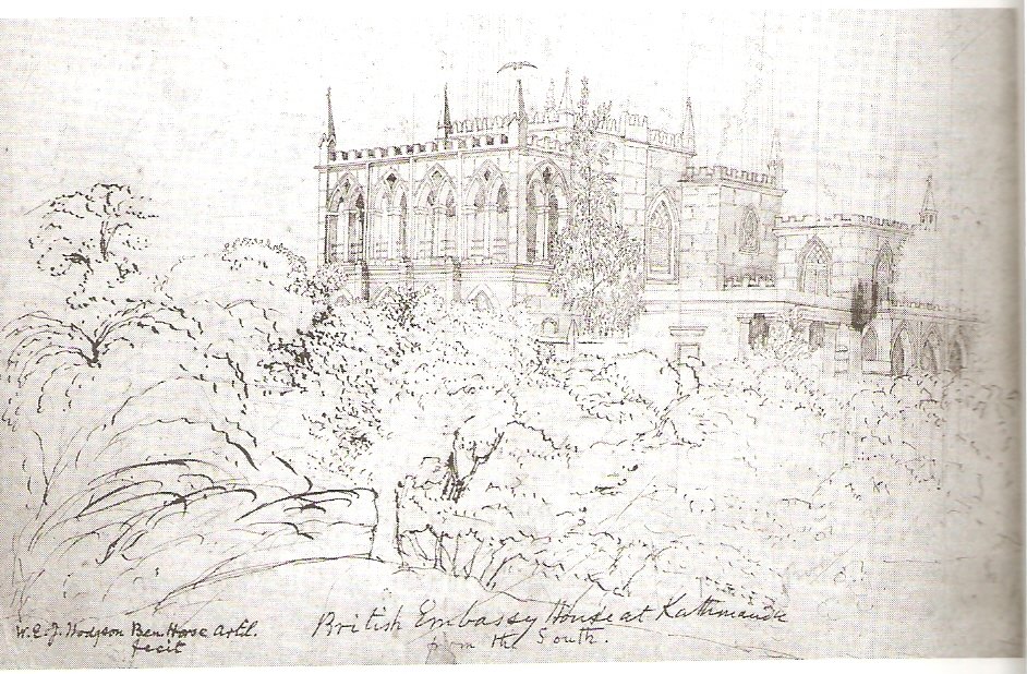 This house was enlarged in 1826 with a neo-Gothic stone wing that included a large hall that could be used for durbars (and later became the Residency chapel). This assemblage was first sketched by William Hodgson, the brother of the Resident, in (probably) 1828. It was painted by an accomplished Nepali artist, Raj Man Singh Chitrakar, in the 1840s, and by the Residency Surgeon, Dr Henry Oldfield, in 1850. The Residency land, and the several buildings on it, passed to the British government when the East India Company was wound up in 1858.