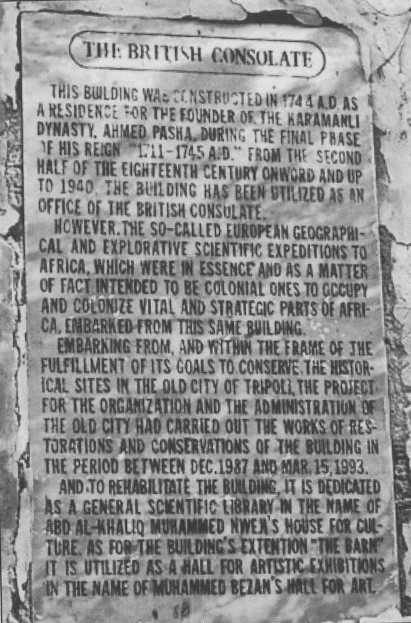 In the late-1940s, the building was being used as a store by a Maltese coffin maker. It was restored by the Libyan authorities between 1987 and 1993 and is now [?still] an Historical Museum or House of Culture. The almost 200-year occupation of the building as the British consulate is recorded in English on a 1993 commemorative plaque fixed to the exterior (the wording also takes the opportunity to criticise the motivation of the explorations mounted from this building).