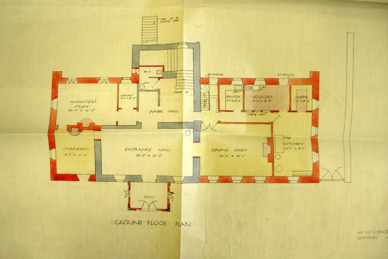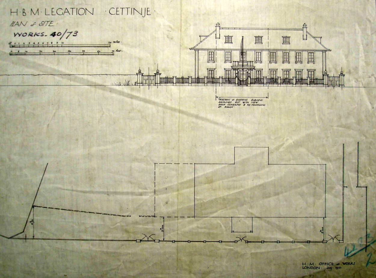 The chargé d’affaires Post at Cetinje became a legation in 1911. A line of four small houses close to the royal palace was bought in 1912 at Katounska Street for £6,000 from Herr Gisbert von Pilgrim Baltazzi. The Office of Works then spent £5,000 on extensive remodelling and adaptations, designed by one of its architects, Julius Bradley, to create a legation house. Work on the site came to a standstill when the First Balkan War broke out in October 1912 but direct labour, including Turkish prisoners, was later drafted in and the work was completed in 1914 under the supervision of the Office of Works’ clerk of works W C D’Harty, who was then arrested and only narrowly escaped internment. Richard Allison, the principal architect, was making the final inspection of the work when the First World War broke out. A presentation drawing of the scheme by Palmer-Jones was exhibited at the Royal Academy in 1916: the building’s fenestration and roof with wide eaves was characteristic of the Office of Works manner of the time.