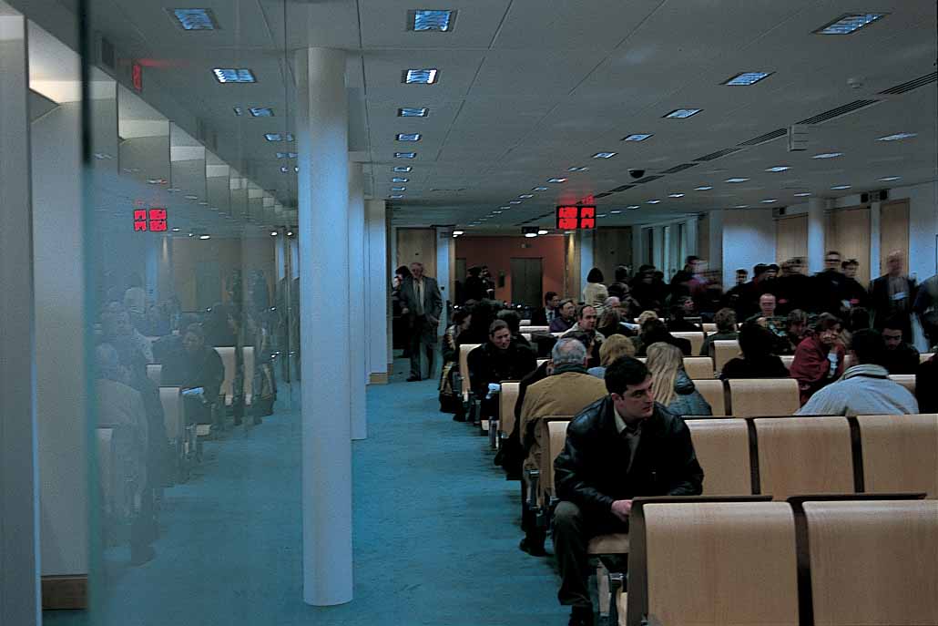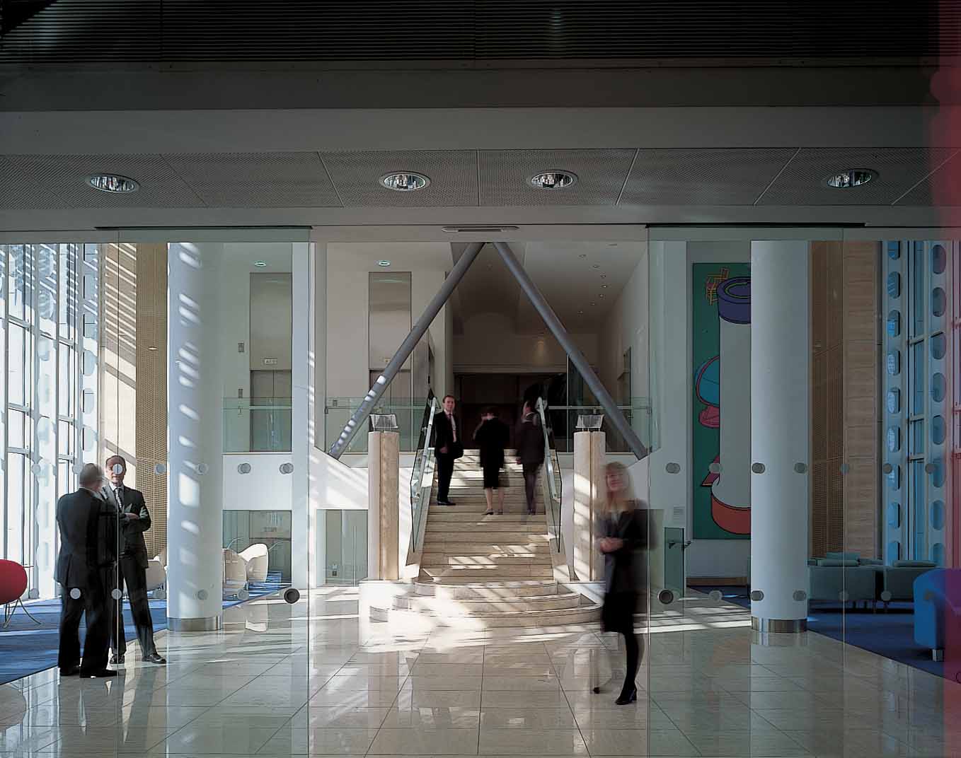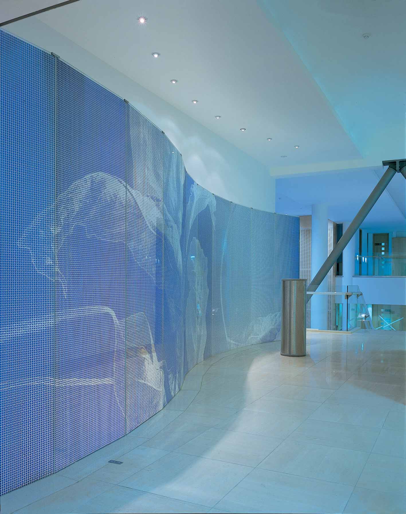An Arts Policy for the building was agreed upon in principle in 1995, to be considered in tandem with the interior design and furniture issues. Burton’s previous championship of the nation-wide Percent for Art campaign, which encouraged clients to set aside a small percentage of their building budgets for artworks, was a key stimulus. The FCO had the broad intention to allot about 0.5% of the original building budget, £300,000, to artworks, and to form a specialist committee to oversee the selection and management of the arts programme. There were, of course, overlaps with both the building and furnishings budgets. The result was a fine range of artworks. Those commissioned included: a coat of arms by Roman Halter, 31 enamel panels of text, the layout of the granite setts in the forecourt, a double-height metallic etching by Norman Ackroyd, paintings by Michael Craig-Martin, a glass wall by Alexander Beleshenko, two relief paintings by Langlands and Bell, six printed wall texts, and a projected transparency by Alex Hartley. A magnificent water sculpture by William Pye intended to sit in the landscaped area in front of the building proved too expensive at a time that sponsorship was drying up.