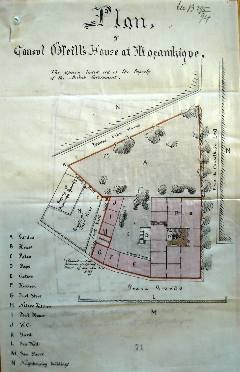 The first consulate was established in 1873, in a leased house on the small Island of Mozambique, then the capital of Portuguese East Africa. Henry O’Neill, who arrived as consul in 1879, liked the house so much that he bought it himself in 1883 and remained the consulate’s landlord after he left Mozambique in 1884. In 1891, by then the consul at Leghorn, he sold the house to the British government for £1,500 and it continued to serve as a consulate on the Island of Mozambique until 1900. In that year, it was leased to the local Telegraphic Cable Company, and was eventually sold to the French government in 1915.