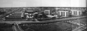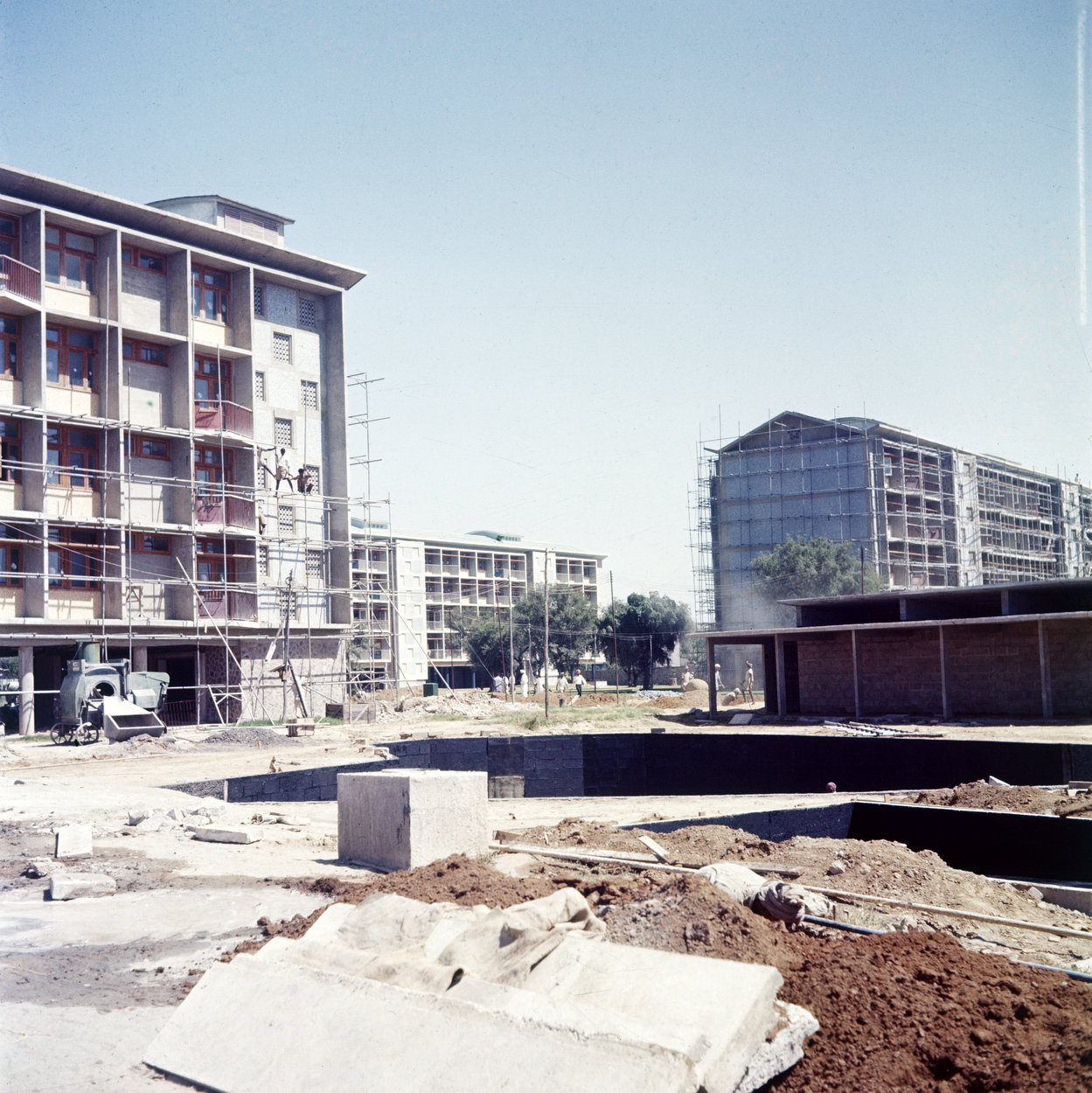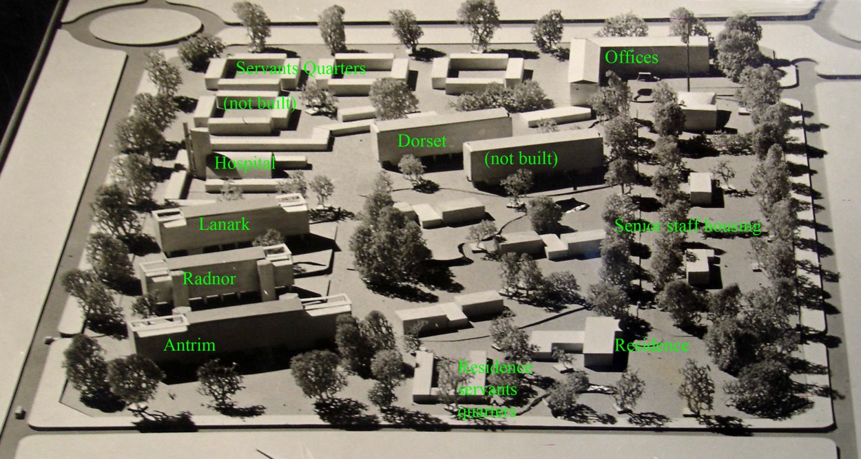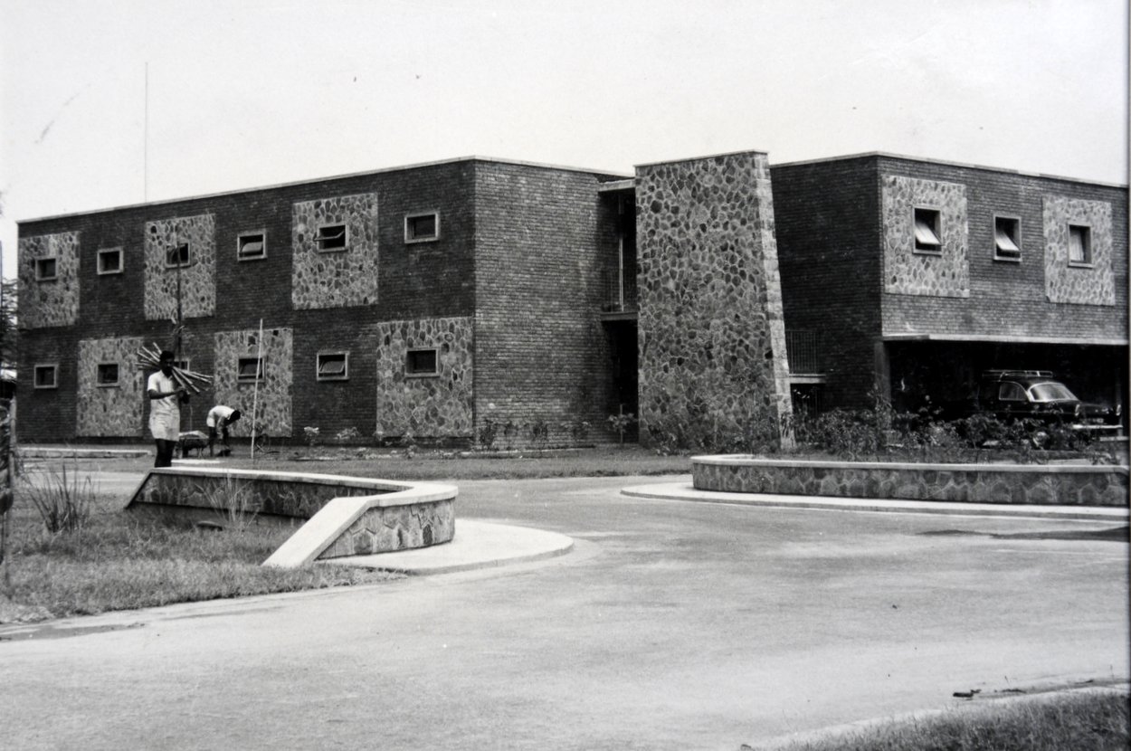 The compound was built in three phases. The first phase started on site in December 1955, under the managerial control of a senior Ministry of Works site control officer, A Watson, and comprised the boundary wall, roads and services infrastructure with plant house, 54 flats for middle and junior grade UK staff in three five-storey blocks, and sick bay, community centre, swimming pool and servants’ quarters. This phase was completed and occupied by the time that the Prime Minister, Harold Macmillan, laid the foundation stone for the office block in the second phase in January 1958. This phase, which took until 1960, included all the offices, workshops and garages. The third phase began in 1960 and included the fourth block of flats and six houses for senior staff: it was completed in 1962. Full occupation of the compound was achieved in the same year, fifteen years after independence.