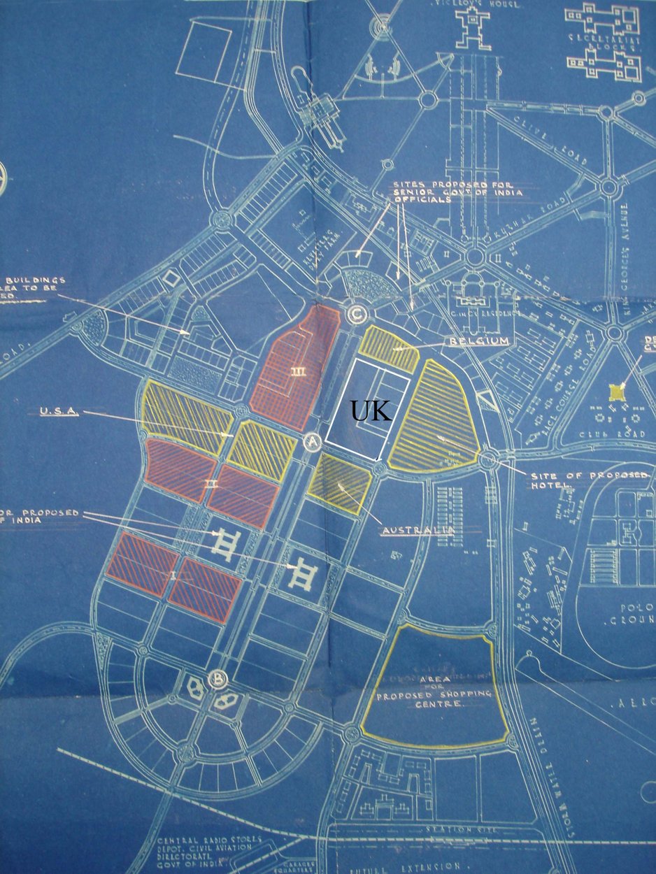 Nye’s arguments were accepted in London, including by the Treasury who made a £75,000 provision in the estimates. The high commission earmarked two possible sites ‘on the strict understanding that such earmarking must not be interpreted as a definite undertaking to acquire land.’ The Indians proceeded surprisingly rapidly with the infrastructure, and introduced a slightly more favourable commuted ground rent formula. The estimated UK requirement for 24 acres for offices for the 115 UK-based and 200 locally engaged staff, and residential accommodation for the UK staff and their domestic servants, was substantiated. In September 1950 the newly-arrived Ministry of Works architect, Alex Tough, proposed the selection of a site lying along the central vista that he thought was better than either of the provisionally earmarked sites: it comprised 29 acres but he thought that its northernmost 5 acres could be lopped off, leaving the high commission with four increments of six acres. The Indians agreed in principle, and suddenly the pace hotted up because the high commission was desperate to make a start on building junior staff accommodation on the site. In October, the Treasury authorised taking up to 20 acres of the now-preferred site while accepting that, if the Indians refused to deal in less than six acre increments (which everyone knew they would), 24 acres would, reluctantly, be permitted. And so it was. Treasury also preferred the commuted rent formula, which eventually worked out at a capital premium payable of £156,650 for 24.11 acres of land, and a nominal annual ground rent. The address of the site was (and remains) Plot 3, Block 50C, Chanakyapuri, New Delhi.