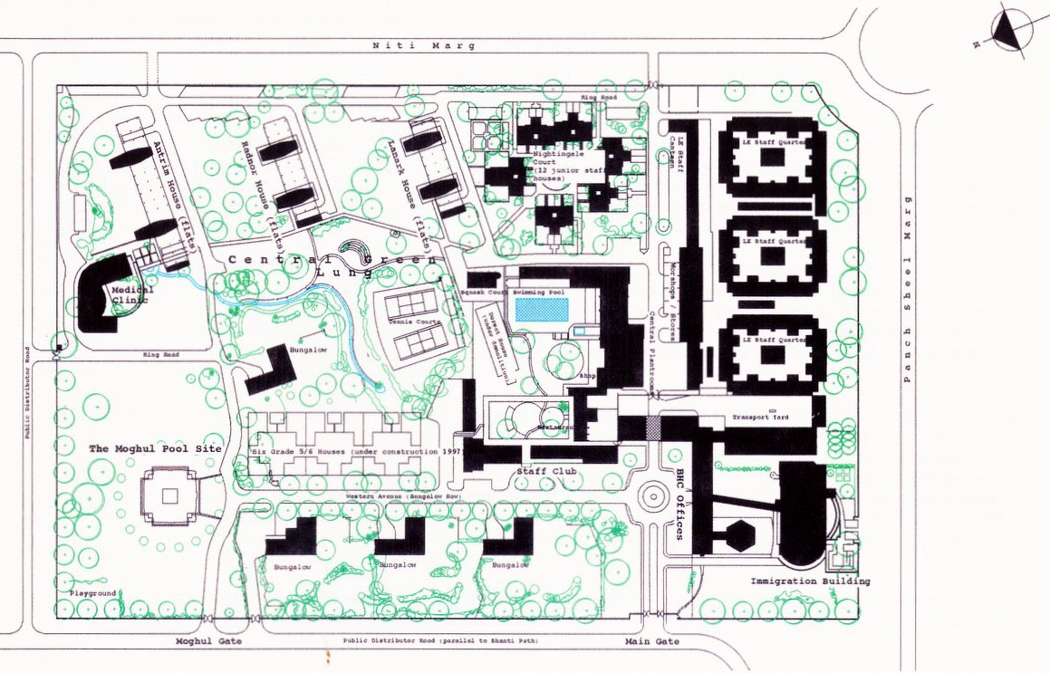 A highly respected local architect, Raj Rewal, was commissioned to design 12 junior staff houses on the site of the old hospital. These were completed in [?] and the ensemble was named, via a staff suggestion process, Nightingale Court (after Florence, not the bird).