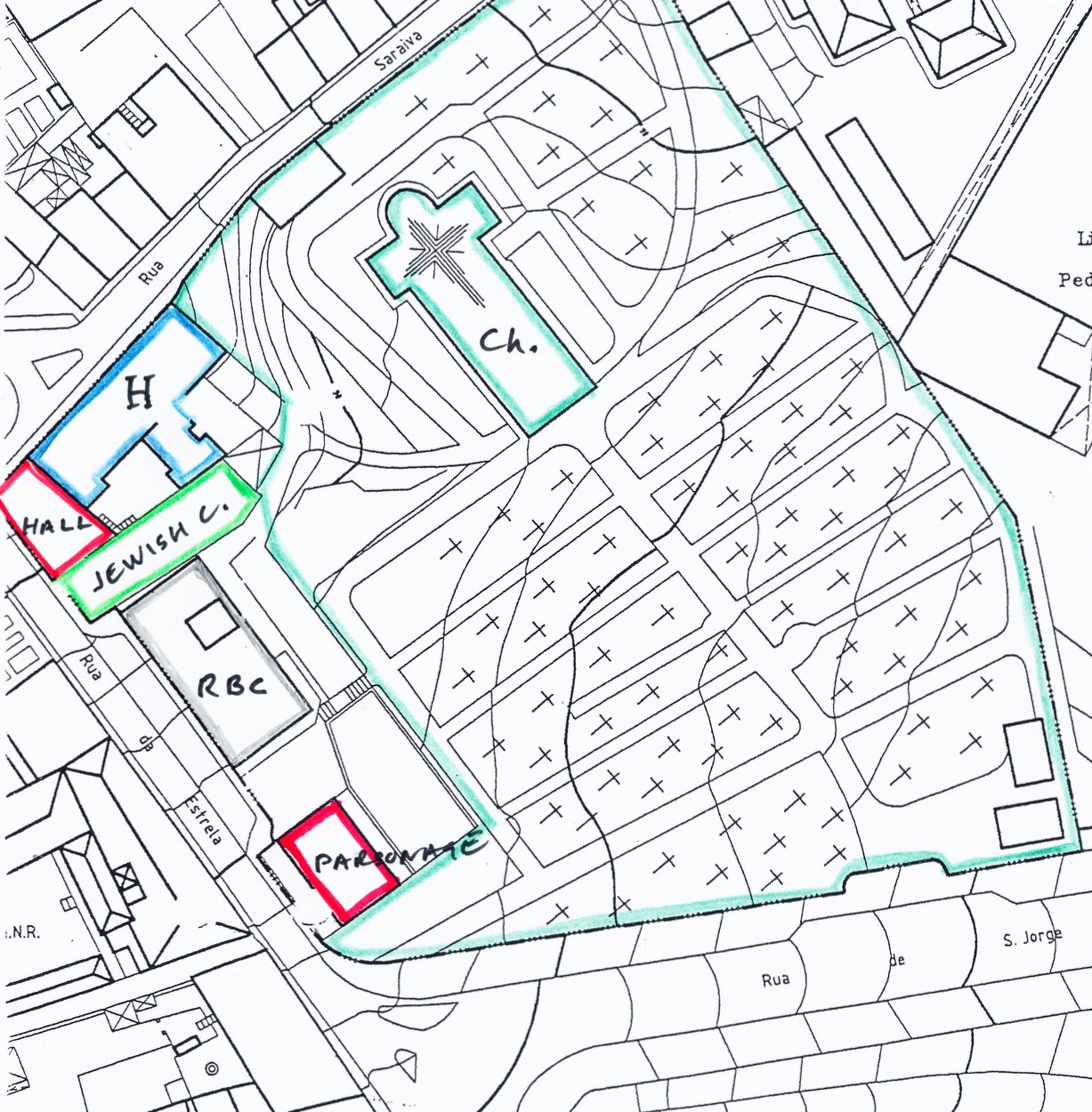The present buildings on the non-cemetery strip are, from north to south: the British Hospital (formerly a school); the Estrela Hall (built as the church’s parish hall in 1906 and now a small theatre run by the Lisbon Players); the (old) Jewish Cemetery (with 151 graves, the last dated 1869); the Royal British Club (built in 1962); and the Parsonage (a fine house built in 1795, originally as a hospital). In the early 2000s, the FCO sought to dispose of this strip for the benefit of all the parties, but dogged resistance by the Lisbon Players stood in the way. [?present position]