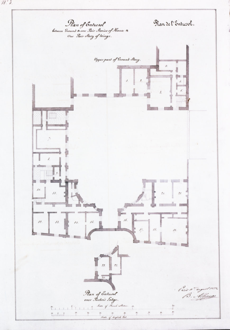 Soon afterwards, in 1824, the Treasury turned to the Office of Works for advice on the extent of further restoration work necessary. The Office responded by asking Robert Smirke to visit Paris and report on the state of the house. He found that there was a considerable maintenance backlog and he particularly warned that work was urgently required on the two wings. This work was approved by the Treasury but, before it could be carried out, Lord Granville succeeded Sir Charles Stuart as ambassador and was much more concerned about what he saw as deficiencies in the furnishing of the house, to which ‘it does not appear that the attention of Mr. Smirke has been particularly called.’ Granville therefore asked for another visitor to come and advise on putting ‘the hotel in a condition fit for the residence of His Majesty’s Ambassador’. Lewis Wyatt, a nephew of James Wyatt and a clerk of works in the Office of Works, was accordingly sent to Paris in early 1825. He concluded that about £25,000 would be required to restore the house and stables, repair and replace furniture, and build the chapel that the ambassador had requested at the end of the garden.
