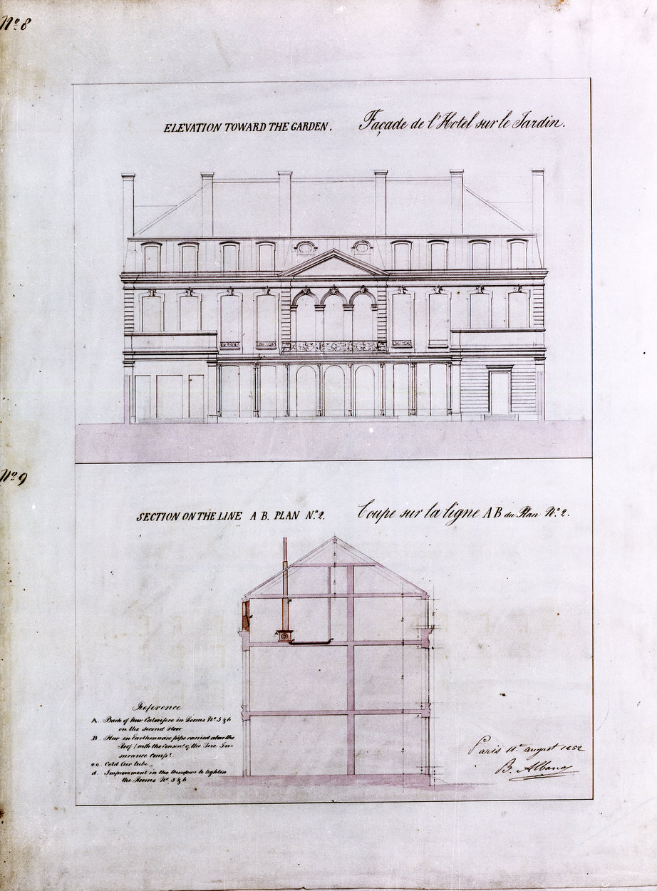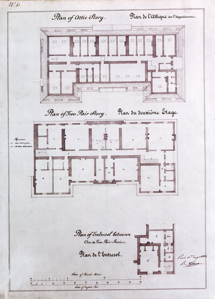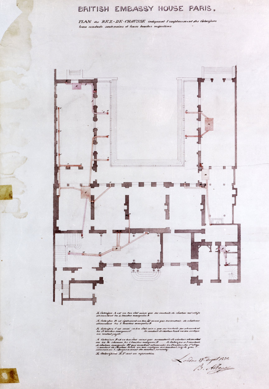 With the purchase of 39 rue du Faubourg Saint Honoré in 1814 as the British ambassador’s residence, HM Treasury became responsible for ensuring that the building was properly maintained by the embassy. Although the fabric of the house has hardly been changed over the last 200 years (unlike its two pavilions), the interiors of the main rooms have been often and variously changed, with different degrees of necessity and skill, to reflect changed times and tastes. Many published histories of the house tend to chronicle the ambassadorial, decorative and furnishings aspects of these changes. The following pages concentrate instead on the major refurbishment programmes that have been carried out over the last 200 years.