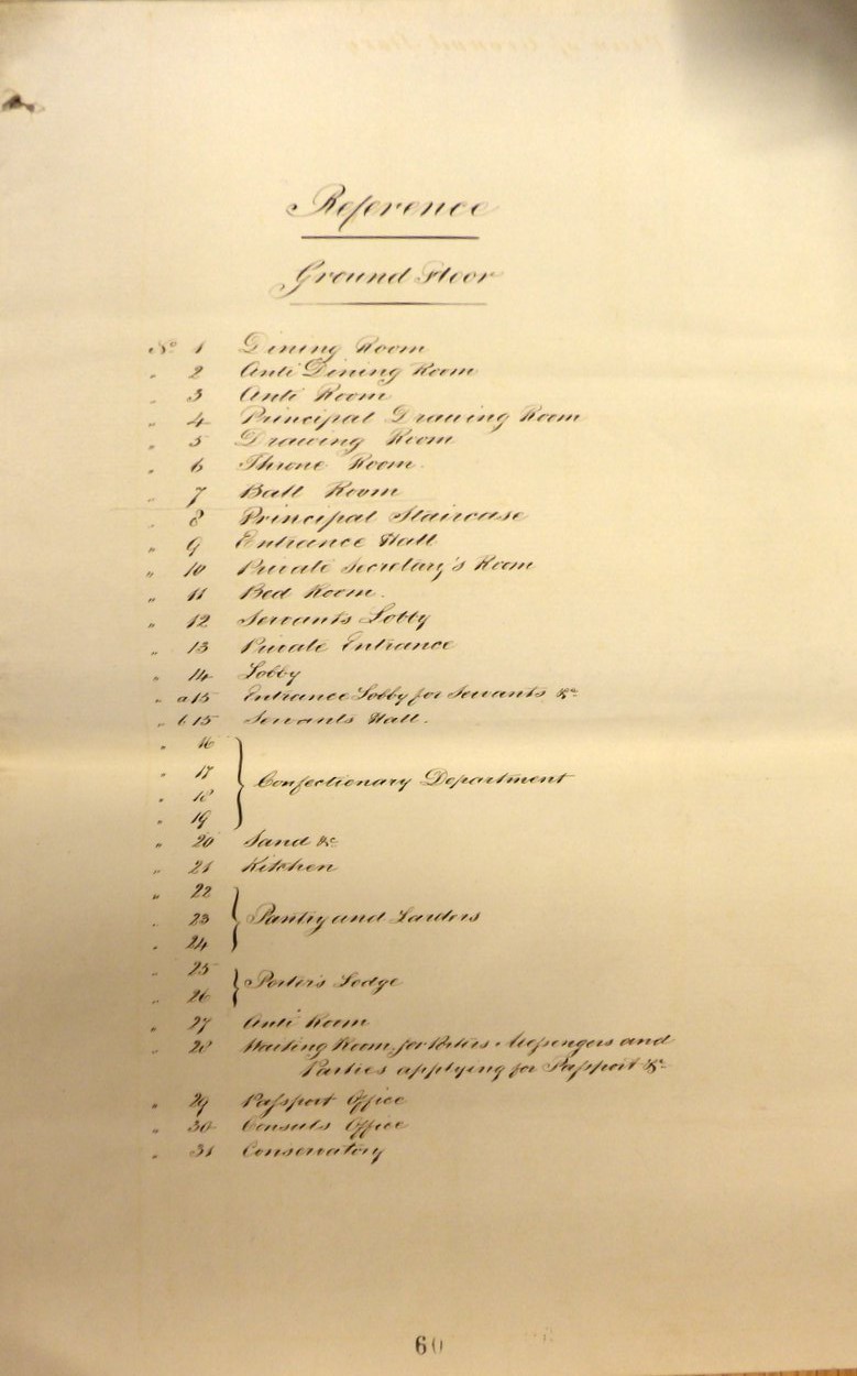 The Office of Works asked the architect Decimus Burton, whom it regarded highly for his reliability and professionalism, to report. He first visited Paris in June 1840 and his findings were thorough but not dramatic. He had found no plans of the house, so had made nine drawings of his own; he thought a new inventory was needed, not least to distinguish between items owned by the government and by the ambassador. Palmerston pressed for Burton’s recommendations to be put into effect but, before they could be acted upon, Granville was succeeded in late 1841 by Lord Cowley, brother of the Duke of Wellington, who considered the house to be in such bad condition ‘that it was impossible to live in it’. Cowley and Burton accordingly adjusted the programme to suit Cowley’s revised priorities and the next ten years saw a relatively stable managerial routine. Burton, as supervising architect, made annual inspections, reporting to the Office of Works commissioners after each visit and providing them with an estimate of the costs of repairs which it would be sensible to carry out during the following year. Silveyra prepared and oversaw the contract work. During this period, the main building was re-roofed in 1841; the west pavilion, which by then housed the chancery and passport offices, was extensively repaired; a new throne was provided in 1842; and the cour d’honneur was repaved again in 1851.
