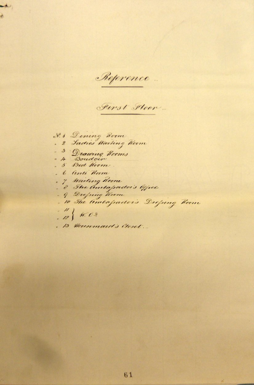 Chastened by the costs of the house, the Treasury posted the Hon. Frederick Byng to Paris in 1830 to keep a tight rein on expenditure and supervise the accounts. With the appointment the following year of a new local architect, I Silveyra, to carry out regular inspections and supervise all repair works, it looked as though effective management might be in place. But in 1835, Granville, at the start of his third incumbency as ambassador, called for an estimate of the cost ‘for rescuing the interior of the hotel from its present degraded state’. Silveyra reported that the building fabric was mainly in adequate condition but the bitumen with which the wings had been roofed only ten years earlier should be replaced, and a further £1,000 needed to be spent on the interiors. This time it was the Foreign Secretary, Lord Palmerston, who decided that the embassy house should be sold: over £30,000 had been spent on repairs since it was bought twenty years earlier. Granville again successfully contested this conclusion and Palmerston reluctantly authorised £2,500, a third of which was for roofing the wings in copper (which he insisted be bought in England).