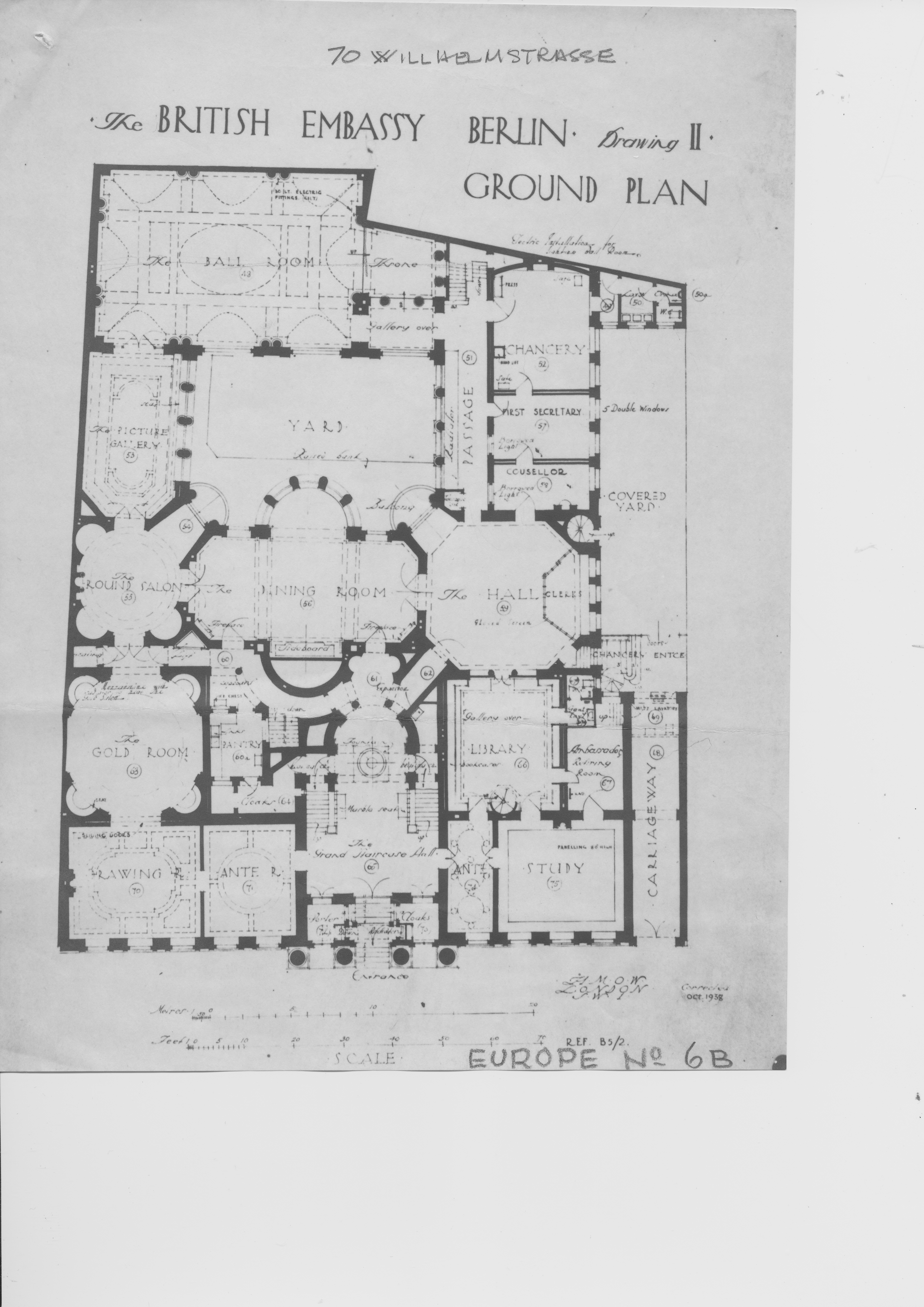 The Palais stood empty throughout the First World War, apart from a caretaker and a Dutch diplomat after The Netherlands became the protecting power, and was relatively unscathed. But its central portion suffered some damage during the revolutionary upheavals from a fire on 6 December 1919, which the Office of Works repaired before an ambassador, Lord d’Abernon, returned in 1920. By the time of the arrival in 1937 of Sir Neville Henderson as ambassador, the embassy had swelled to about one hundred staff. Their offices crowded both Palais Strousberg and a separate consular building, and the distance between the buildings was both a time-waster and a security risk. Crowds outside Hitler’s Chancellery, also on Wilhelmstrasse, often made approach to the embassy difficult. Henderson soon began lobbying London for larger premises in a more convenient area but, unsurprisingly, his pleas fell on deaf ears. He later narrated that he had relayed his ideas for a large new site for both offices and residence to Goering and Ribbentrop and asked them to acquaint Hitler with his thinking. That came to nothing either.