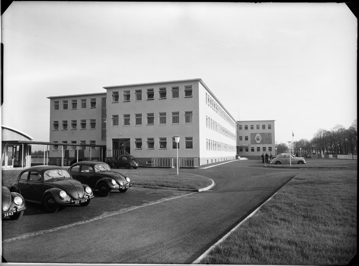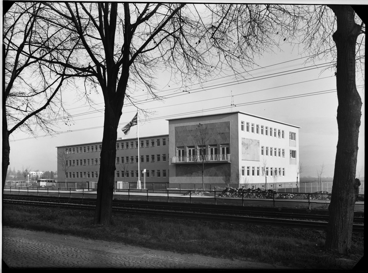 The new offices, with RP Mills as the Ministry of Works as architect in charge, turned out correspondingly mundane in plan and appearance. The local associate architect was Herr Walter Colombo, and the contractors were Wilhelm Dueker and Ludwig Weiser. It comprised three storeys and a basement of an elongated L-shape building, each floor with a spine corridor with cellular offices on both sides, and a large free-standing canteen hall beside. A potential extension was site planned that would turn the L into a U. The building was completed in late 1953 for approaching £150,000, and was too small from the outset. The pre-planned extension was put in hand almost immediately: it, and the corresponding enlargement of the canteen hall, was completed in 1955 at a cost of about £75,000.