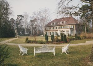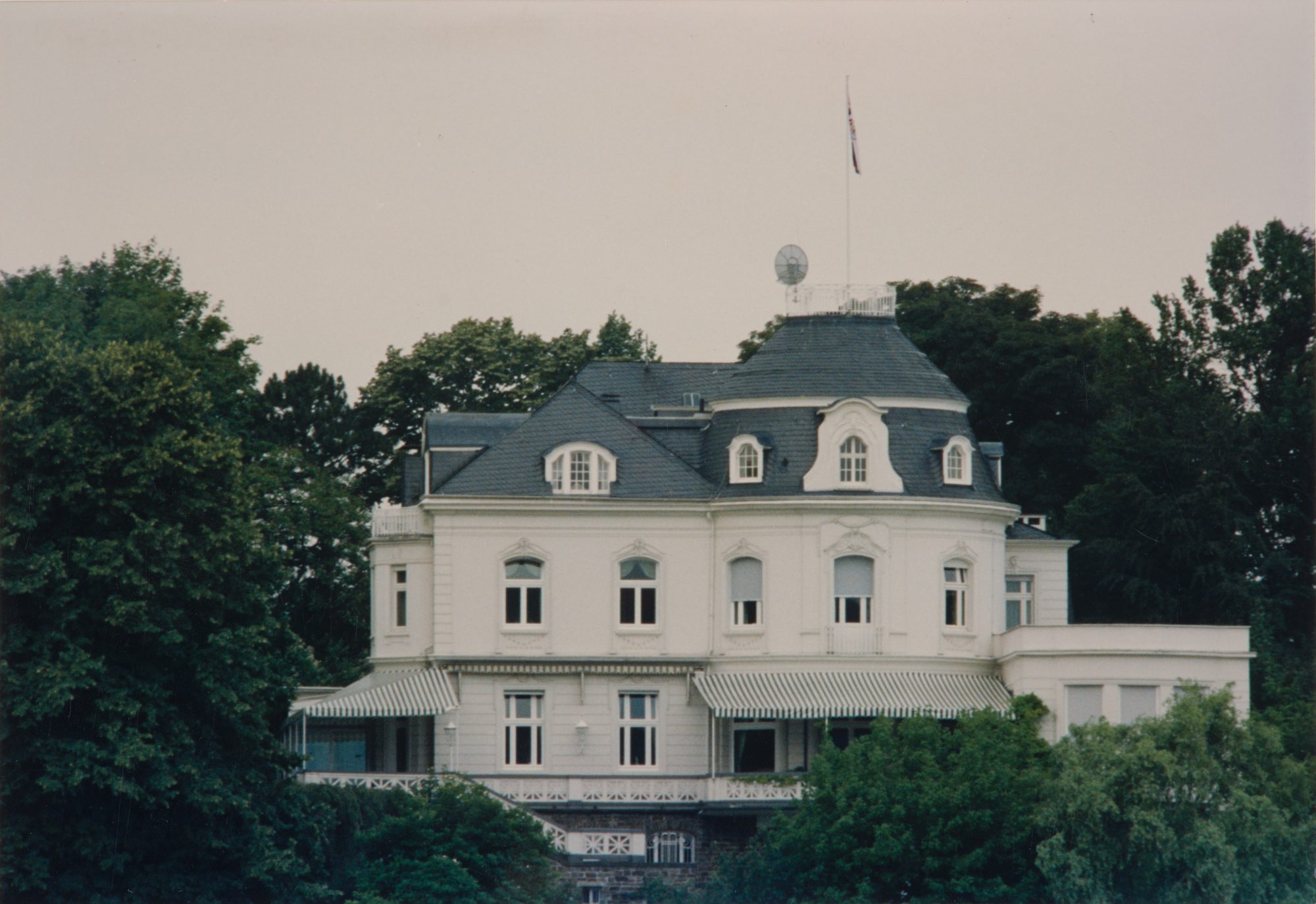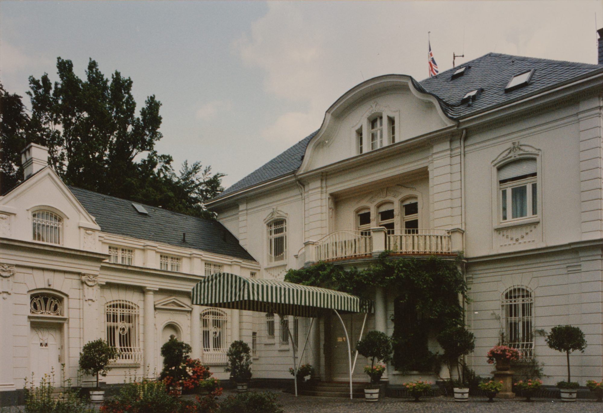 The house, also called Rheinschlussen and Villa Ackermann after a previous owner, was built in 1904 for Fraulein Johanna Cappel. Its architect was Heinrich Plange of Wuppertal-Elberfeld and he produced a pleasing Jugendstil composition. Fraulein Cappel drowned in the Rhine in 1920 and the house passed through several ownerships before being bought in 1941 by Herr Strunck. It was requisitioned in 1945 and used by the American Forces as a transit camp before being renovated as the residence for General McCloy. The Ministry of Works re-arranged the bedrooms on the upper floors before the British high commissioner moved in. The house was always slightly too small: it had no usable garden area so, for many years, part of the adjacent site to the north that belonged to the Diechman family was used for overflow space for large occasions. A detached teahouse was demolished in 1960 and a new dining room constructed, with access to the oval sitting room. The kitchen and staff quarters were extended in 1973 and the small Aubusson drawing room was converted into a library in 1978. The front courtyard was redesigned in 1979 for the installation of the fine stone Sundial by Ian Hamilton Finlay.