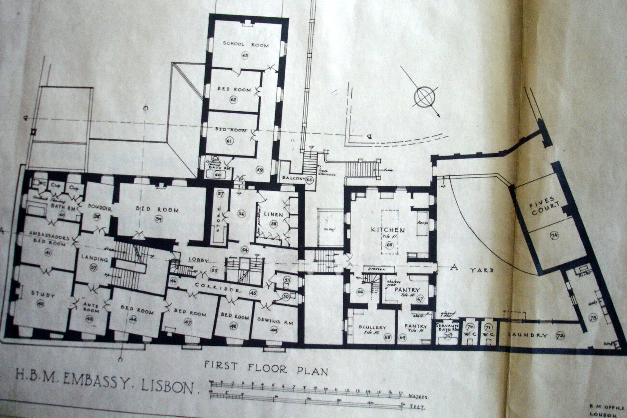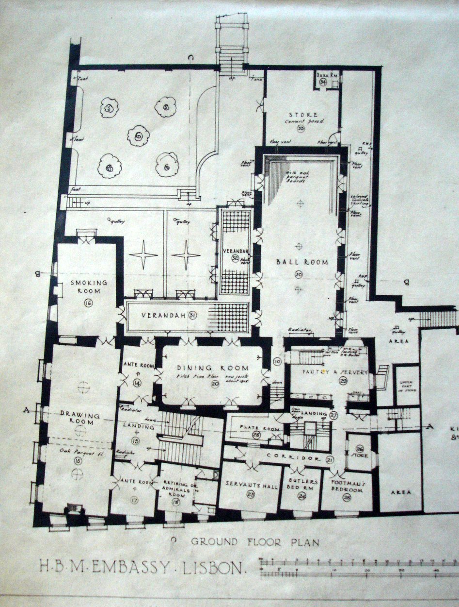 As a mission house, from the outset it included a few offices for chancery. The first were on the ground floor, to the right off the vestibule upon entering. In the early 1920s, the former coach house areas, by then garages, on the lower ground floor were converted to chancery offices (and their former space off the vestibule became the visitor’s waiting room): the coaches moved to a building at the far west end of the garden. The status of the mission was raised to an embassy in 1924. As the 1930s advanced, and the unwelcome interest that the Germans and Italians, in particular, were taking in Portugal grew, the pressures on the embassy greatly increased. The offices in consequence invaded ever more of the legation house, and hardly left the ambassador space for his representational role. At the end of 1937, the ambassador, Walford Selby, alerted the Secretary of the Office of Works, Patrick Duff, to the problem, and warned that the offices might need before long to move elsewhere. In 1940, Howard Jones, a senior architect in the Office of Works, was sent to report in detail: he also took it upon himself to propose a way to rationalise the planning of the house so that it could work more efficiently. But the timing was all wrong, and the improvements were never implemented.