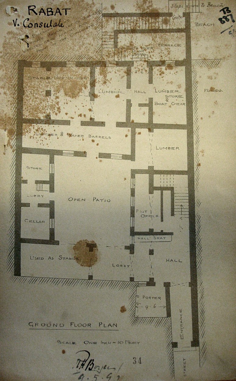 A consular post was first established in Rabat in 1826 and successive incumbents lived rent-free in a house that was granted to them by the sultan on the edge of the Medina and close to the river. It was a two-storey Arab house with an open court at its centre and with the living and office rooms on the first floor. When Rabat became the capital of Morocco in 1912, this vice-consulate building had to serve as the consulate-general until something larger could be found. Its freehold was acquired in 1921. In 1926, a site that the French had confiscated, was bought (and slightly extended in 1929) for a new consulate-general at the corner of Rue de Nancy and Rue Guynemer. Although various sketch designs were proposed for it over the next five years, momentum never built up for its development. This was mainly because Sir Andrew Ryan, a former chief dragoman at Constantinople, was content to continue roughing it in the old Arab house, once the offices had been removed to leased premises in the Rue de Bordeaux.