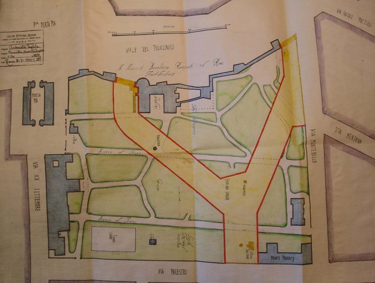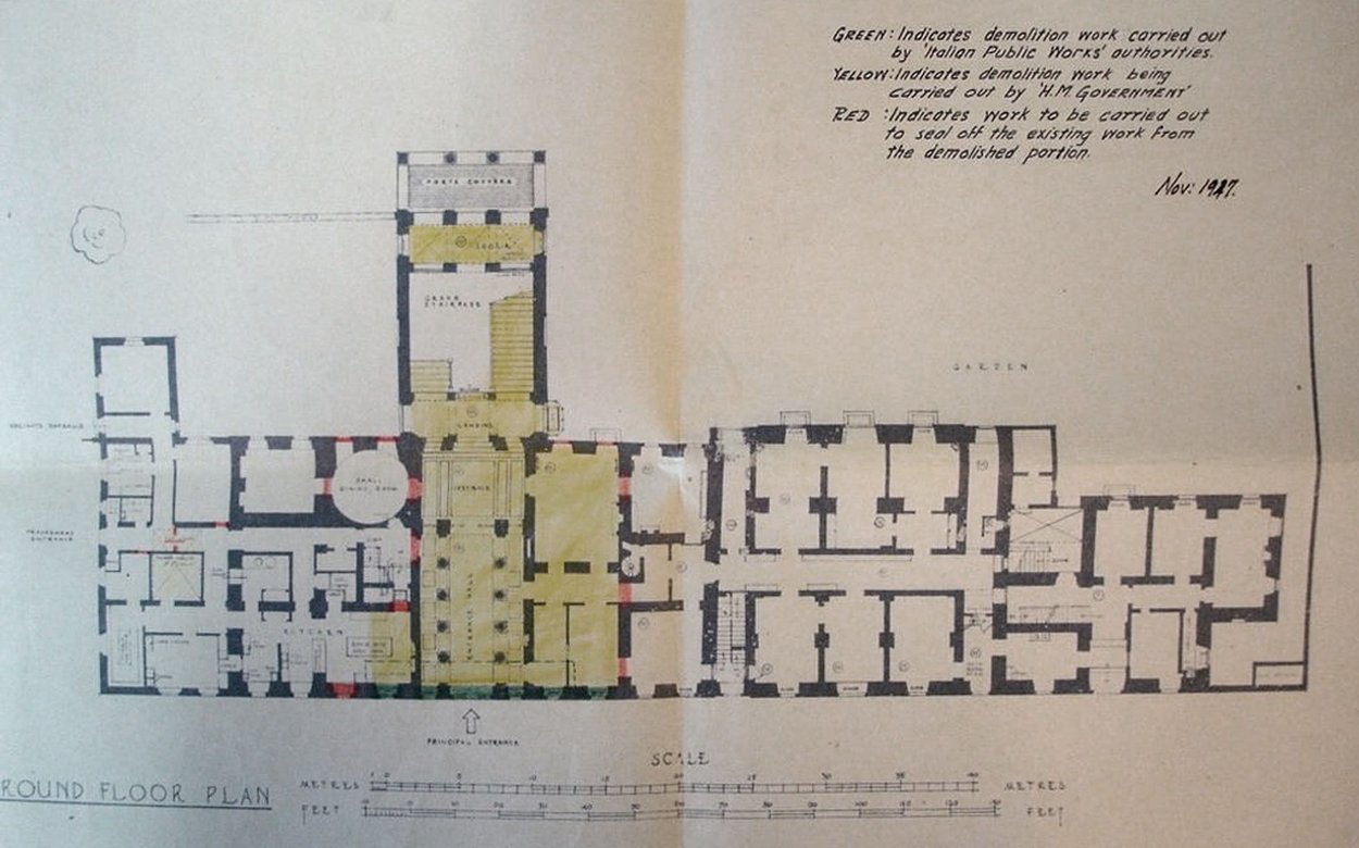 Charles and de Normann also satisfied themselves that leasing the former German Embassy, the Villa Wolkonsky and its grounds, would provide the best means of meeting the requirement to move out of the Via XX Settembre building altogether for as long as it took to build a new residence and offices on its ravaged site. This move was achieved in January 1947. The standing remains of the former building were finally demolished in 1952 by the contractor Castelli. By then, ambassadors’ hopes for offsetting the surrender of some land to enable Via XX Settembre to be widened with the acquisition of the south corner plot that had not been bought in 1882, had been dashed. Most of the site, henceforth referred to as the Porta Pia site, then lay vacant until the start of the construction of new embassy offices on it in 1968.