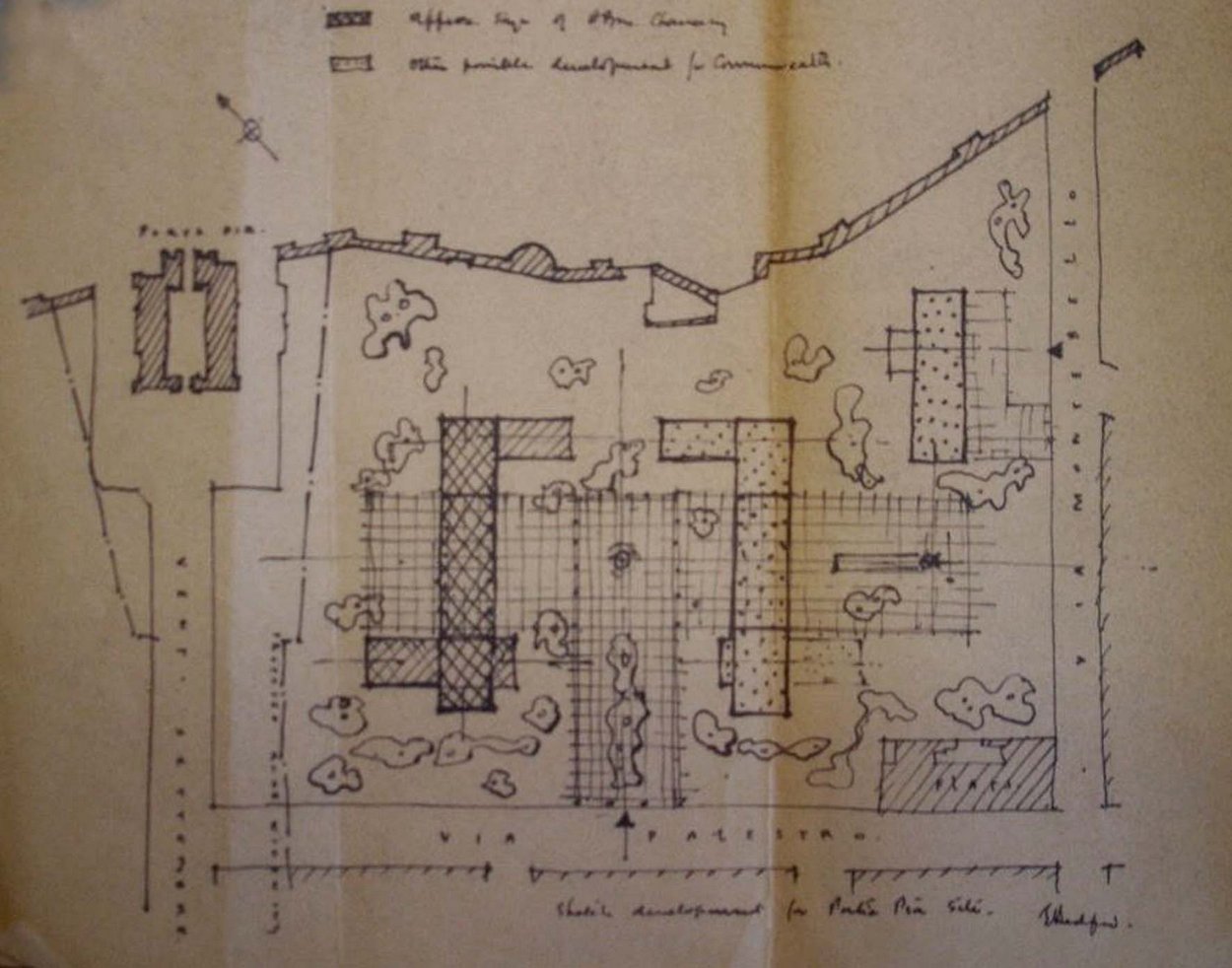 The Ministry of Works’ intention in 1951 was to build new offices and residence at the Porta Pia site so as to be able to sell the Wolkonsky estate as soon as possible. Most, but not quite all, of the succession of ambassadors wanted, however, to retain their residence in the Villa Wolkonsky. The Ministry of Works already had much too much work on its plate to devote sufficient time to Rome. The Foreign Office saw that playing for time was its best strategy, arguing convincingly that many Posts in the world had much worse and more pressing problems than Rome. Significant uncertainties also pervaded the endless debates: particularly about how much capital the Treasury could make available to spend, and about how much the sites were actually worth, given that both were designated parco privato vincolato and therefore potentially immune from development.